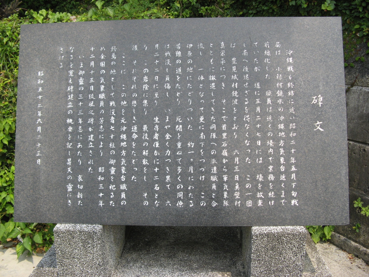 沖縄戦で動員され、軍の作戦に協力した沖縄気象台職員を慰霊するもので、犠牲となった沖縄気象台長ほか関連の職員が祀られています。