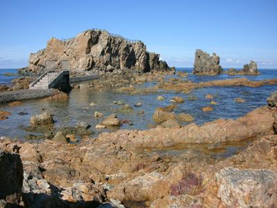 神社から約200mほどの沖合いまで細い遊歩道が整備されていてその先に大きな岩があります。大岩には大人の人が1人通れる位の洞穴があり、そこを抜け階段の上ると岩の上の展望台に行きつくことが出来ます。展望台からは白神山地や前面に広がる日本海などが一望出来ます。