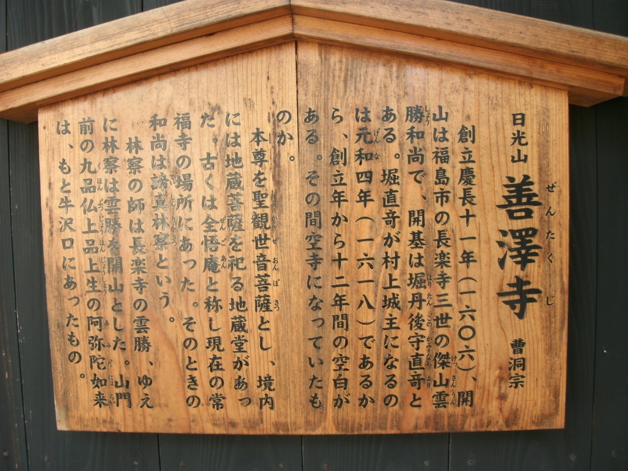 門前にある駒札(説明板)によると、開基は村上城主にもなった堀丹後守直寄だそうです。詳細は駒札の写真を添付しますので参照ください。