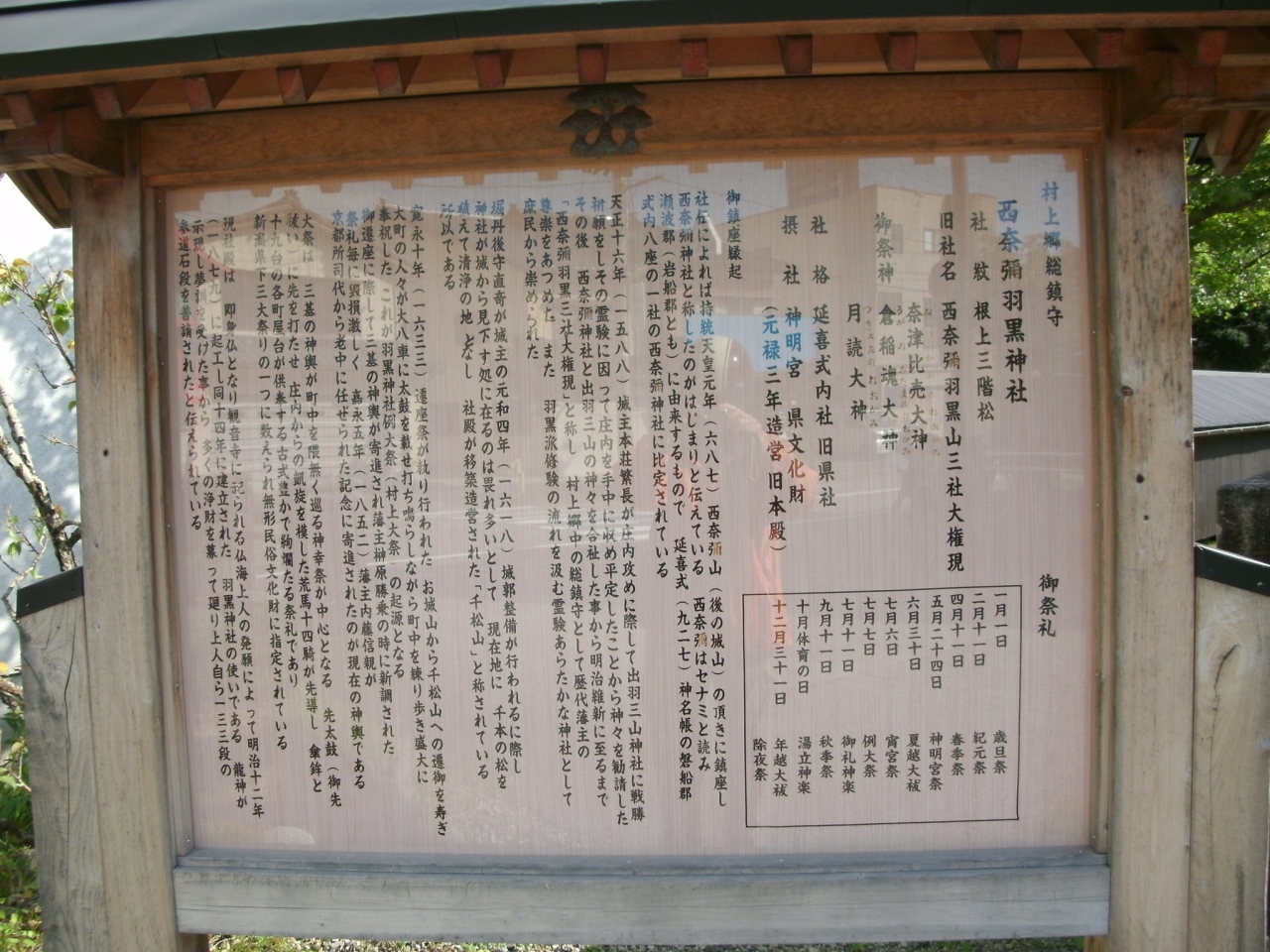 JR村上駅から歩いて20分ほど、村上市役所の南500mほどの山腹に鎮座されています。村上大祭が始まる由緒ある神社で、現地にある由緒書きには、『持統天皇元年(687)西奈弥山の頂きに鎮座し、西奈弥神社と称したのが始まり。寛永10年(1633)、現在の地に遷宮しました。』ということが記載されています。由緒の詳細は写真を添付しますので参照ください。