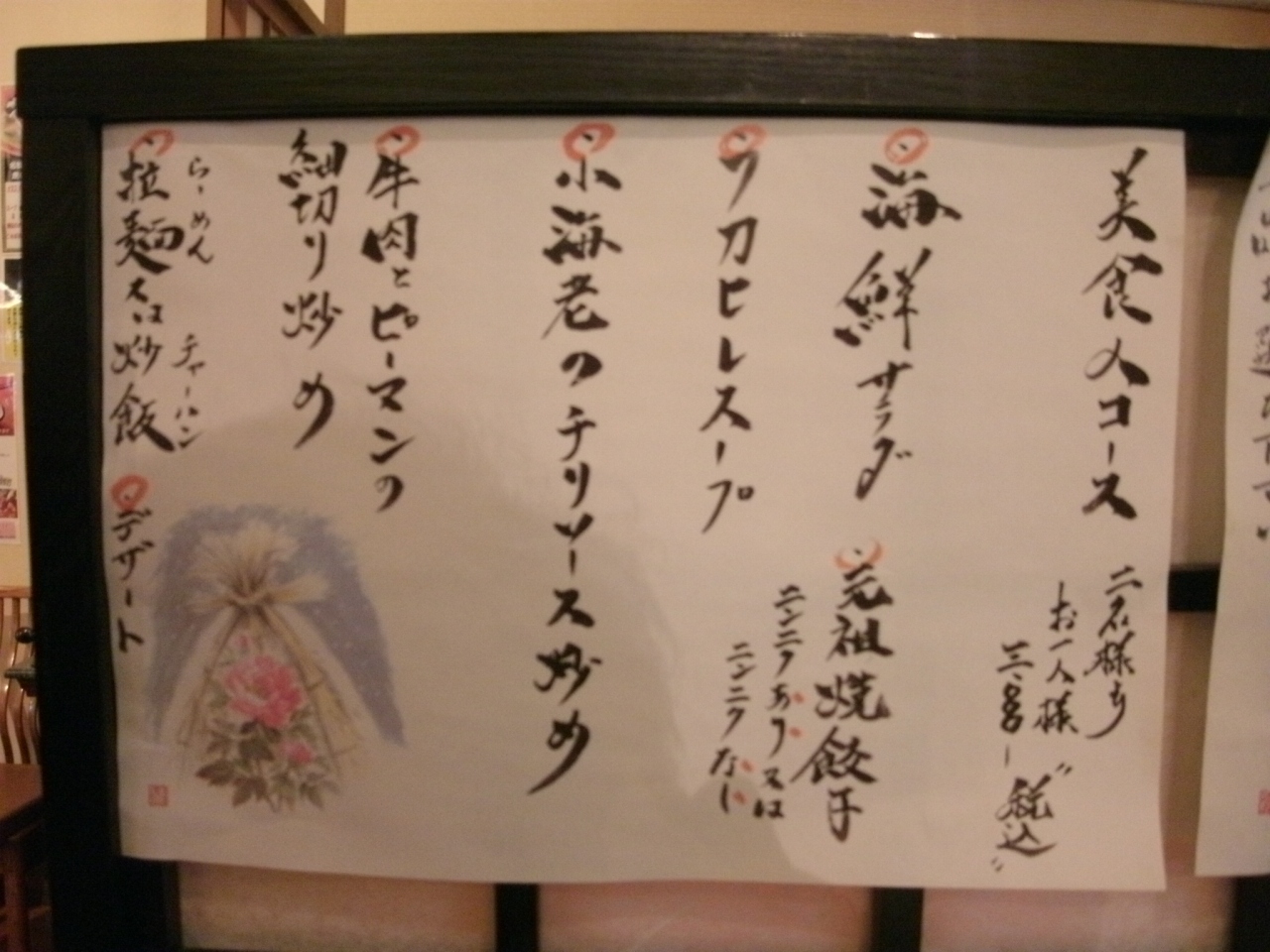 久しぶりにランチに“美食人コース 3000円/人”を頂きました。フカヒレスープ、海鮮サラダ、焼き餃子、海老のチリソース炒め、牛肉とピーマンの細切り炒め、ラーメンOR炒飯、デザートという内容でした。海鮮サラダは5種類の刺身がサラダになったもので新鮮でとても美味しかったです。海老チリは海老が大きくプリプリでよかったし、炒飯も美味しかったです。焼き餃子はニンニク無しを選んだのでパンチがなく、ニンニク有りを選ぶべきと思いました。6種類から選べるデザートで、抹茶杏仁豆腐とマンゴーアイスを頂いたのですが3000円のコースとしては内容的にもボリューム的にもよかったです。