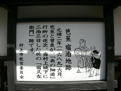 国の登録有形文化財に指定されているという明治期の町屋の風情を残す建物は木造二階建てで、二階は一日一組限定という宿泊施設、一階は「Tea井筒屋」というカフェスペースになっています。入口の左手には芭蕉宿泊地跡『元禄2年(1689年)6月、芭蕉と曽良が「奥の細道」行脚の途次、当村上城下に2泊3日した折の「宿久左衛門」の跡です。』と書かれた説明版があります。