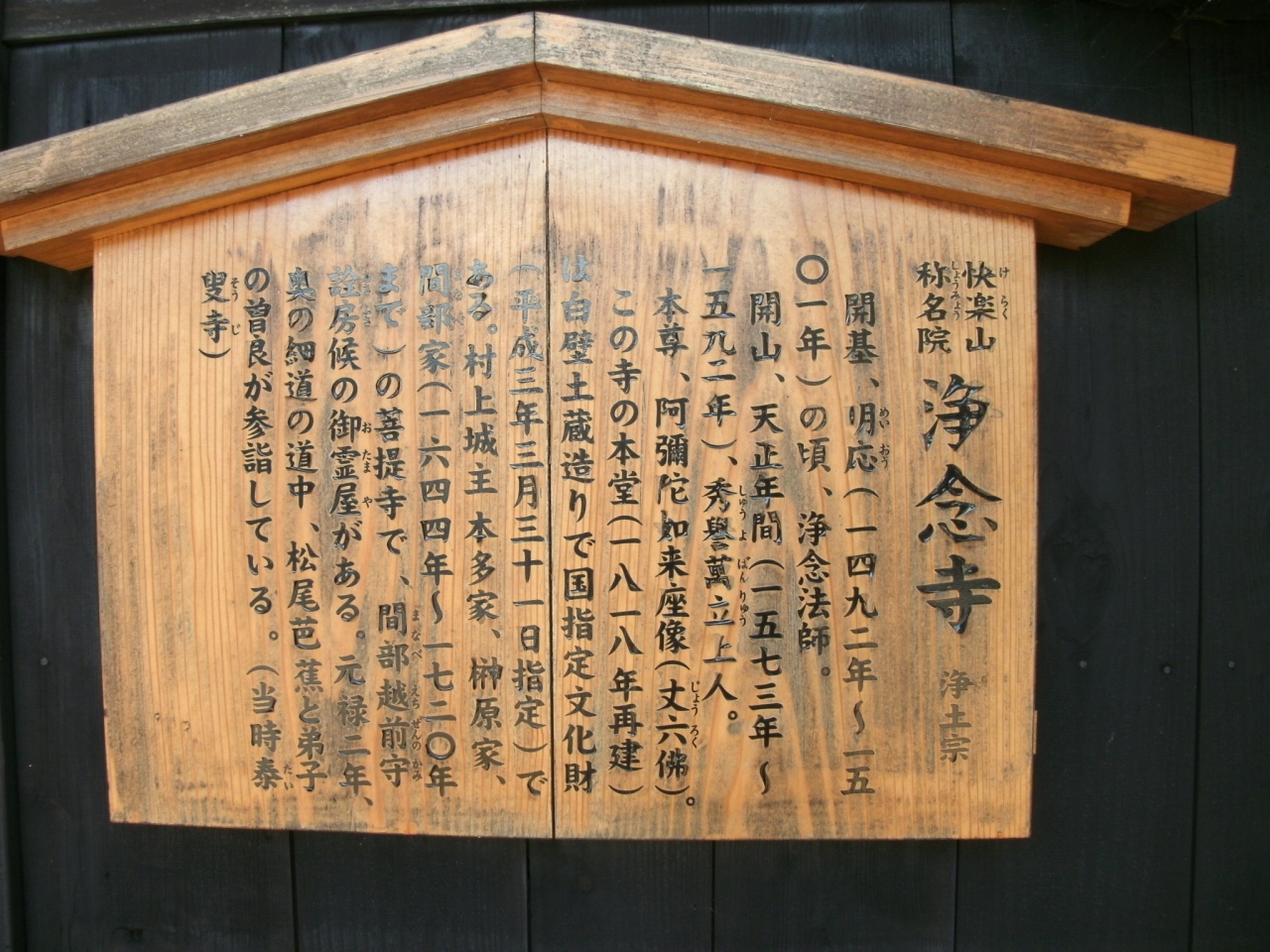 JR村上駅から歩いて15分ほど、“寺町”にあります。お寺の山門に掲げられた由緒書きによると、開基は明応(1492年~1501年)の頃とあります。