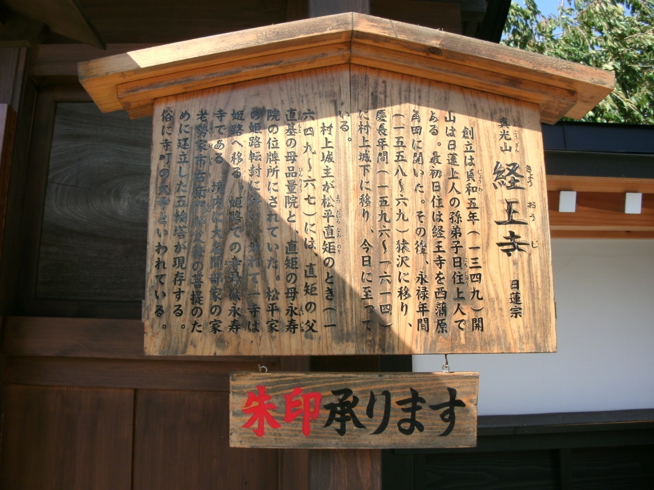 なお、寺町の寺院では由緒書き(駒札)の下に「朱印承ります」の表示板が下げられている(写真参照)ときは、朱印の求めに応じられるそうなので、朱印を収集する方は参考にしてください。- 旅行時期