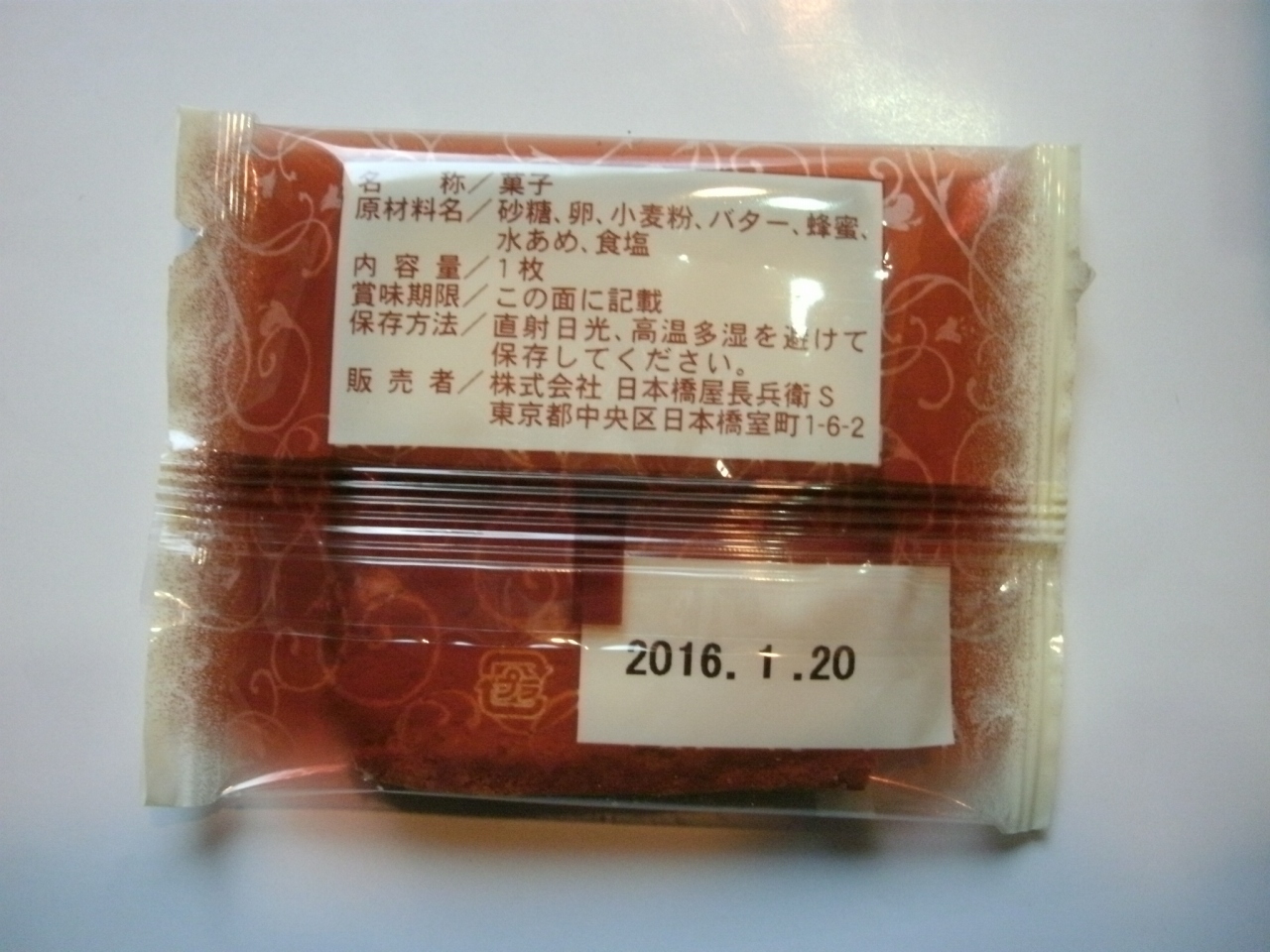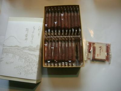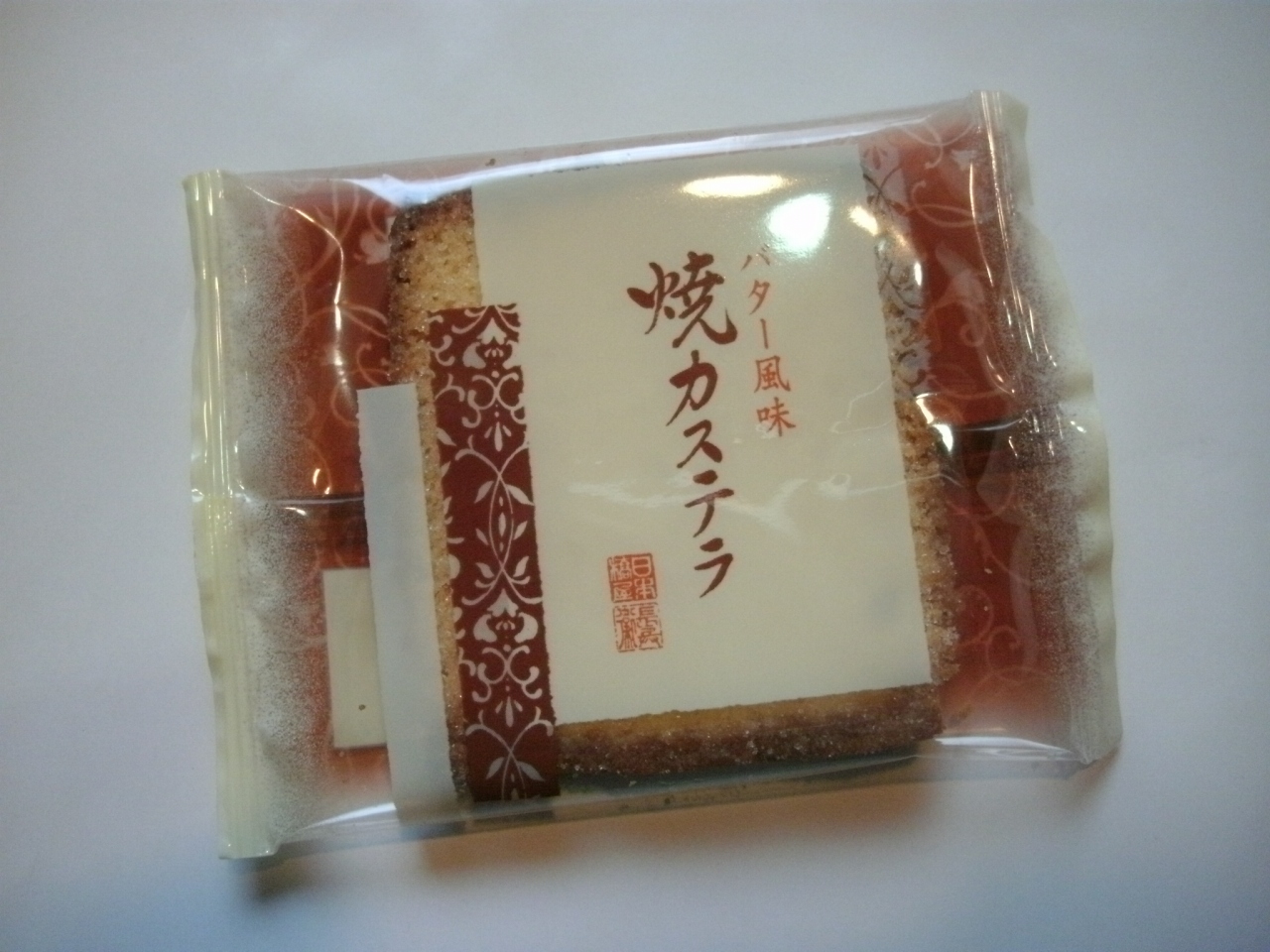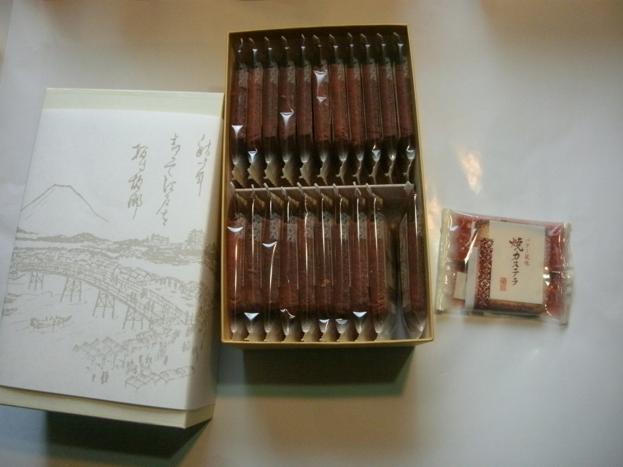 “日本橋屋長兵衛”は東京や神奈川を中心に多数の店舗がある和菓子の有名店です。ここのお店は小田急の相模大野の駅ビルに入っているお店です。最中や饅頭、煎餅など色んな和菓子がありますが、そんな中から自家用として“バター風味の焼きカステラ”を購入しました。さくりと香ばしく広がるバターの風味にほのかな塩味がアクセントになったもので、ほろりとした食感もよく美味しかったです。薄くて軽いお菓子なので若い人にはちょっと物足りないかも知れませんがお年を召した方にはよいと思いました。22枚入りで2160円でした。11枚入りや17枚入り、36枚入りなどもありました。化粧箱もしっかりしたものだし個別包装になっているので、お土産やお使い物などにもよいと思います。