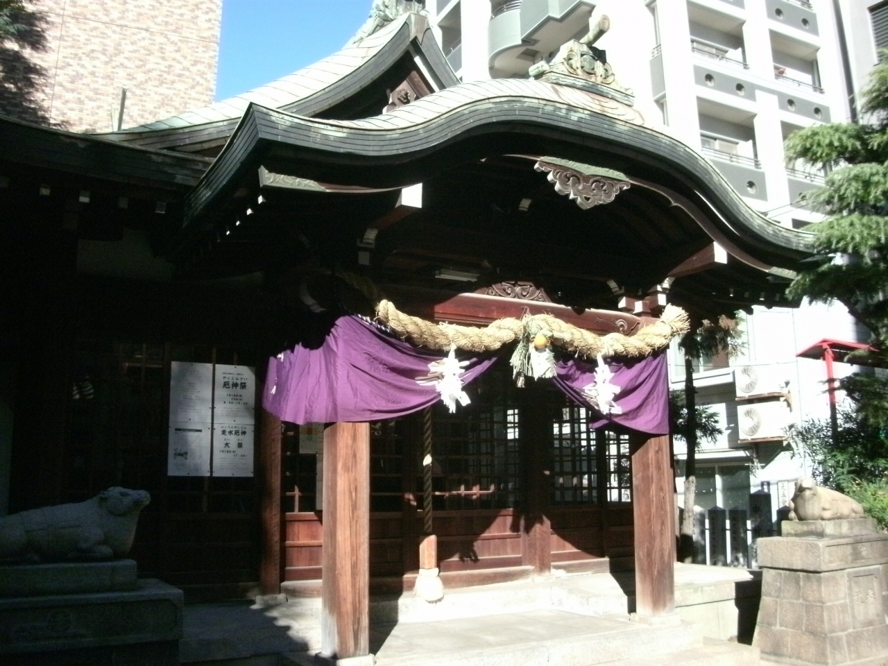 元町商店街の中ほど、商店街から一本南に下がった東西の通りに面したところに鎮座されています。商店街から簡素な鳥居と石標が見えたので、どんな神社か気になって参拝しました。学問の神様といわれる菅原道真公をご祭神とする神社で、書道の神としても有名で、あることから社殿の脇には筆塚があります。狛犬ではなく狛牛が祀られているのも道真公をご祭神とする神社らしいところです。ビルに囲まれた小さな神社で、観光的には特別観るものはありませんが、地元の人々から大切にされている雰囲気を感じることができました。