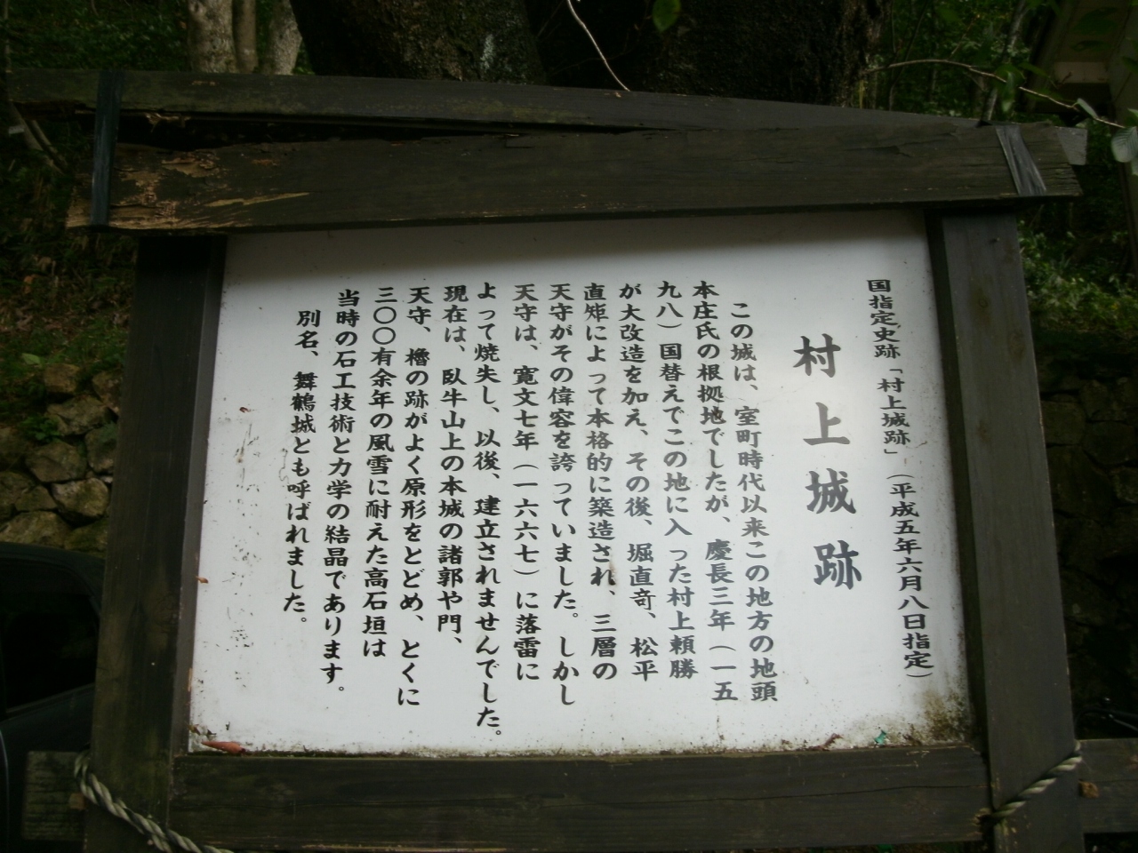 JR村上駅から歩いて30分足らずの場所に位置する標高135mの臥牛山にあります。麓から天守閣跡までは細い山道を15分ほど登る必要があり、結構な運動になります。天守閣跡からは、村上市街や日本海が一望できます。城跡の麓には狭いですが駐車できるスペースもありました。石垣はありますが、建物が残っていないので城跡そのものはそれほど見ごたえがあるわけではありませんので、村上市の中心を散策されるときに、時間があれば登られるのもよいでしょう。
