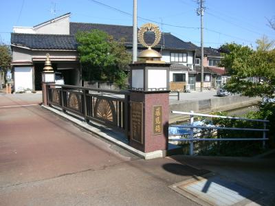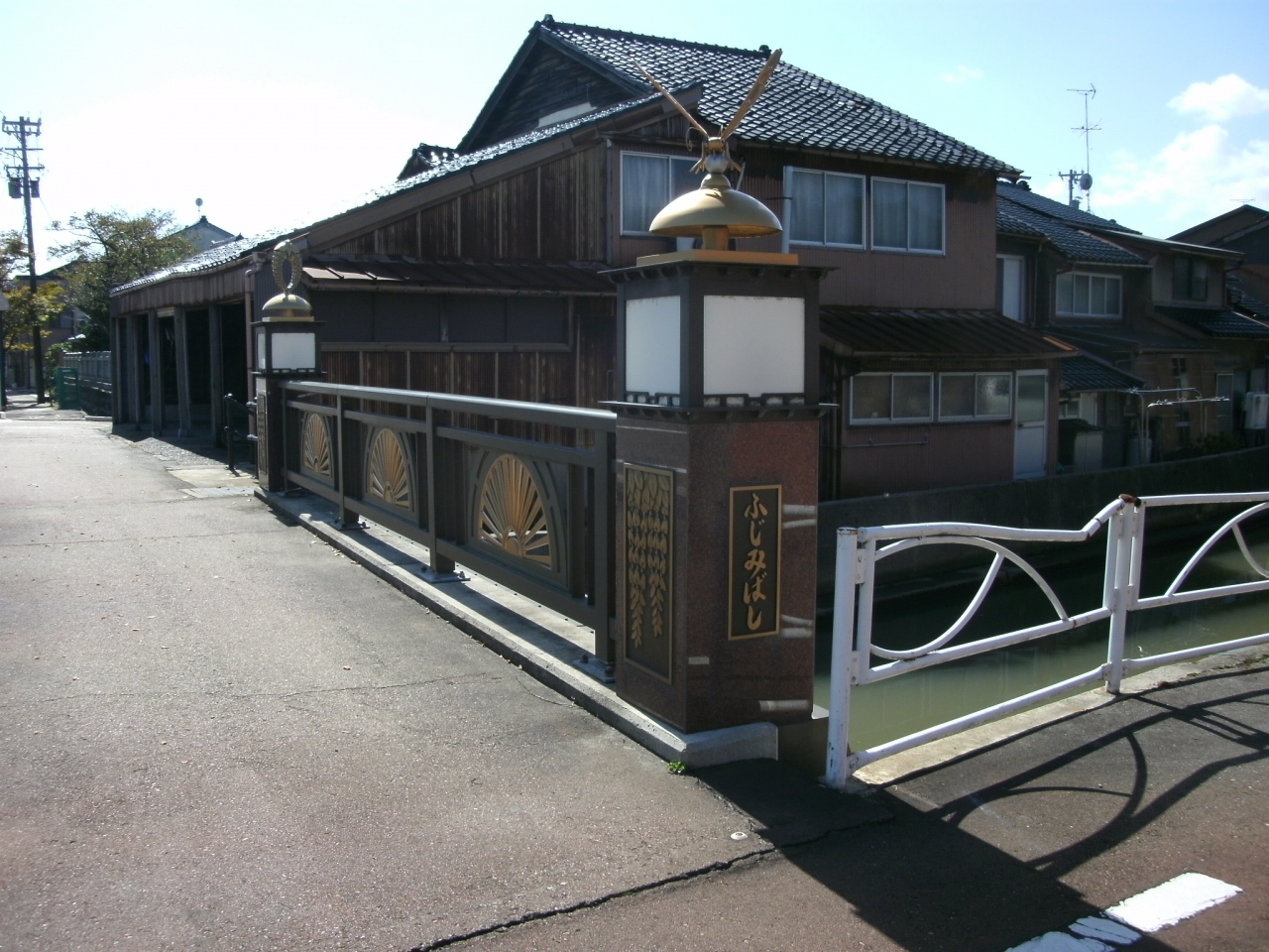 欄干には、新湊の曳山の車輪がデザインされ、欄干の親柱は上部に曳山の蝶や鈷鈴などをモニュメントにした灯篭の形という豪華な装飾の橋になっています。