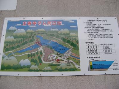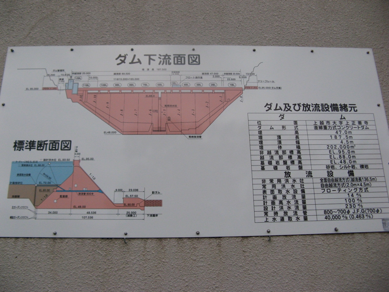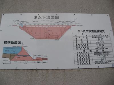 ダムは、洪水調節・給水を目的とした高さ47メートルの重力式コンクリートダムで、ダム周辺には駐車場が整備されダム堤頂も歩道として開放されています。高台にはダム諸元表や周辺の案内地図を設置し、ここからダム湖を一望できます。
