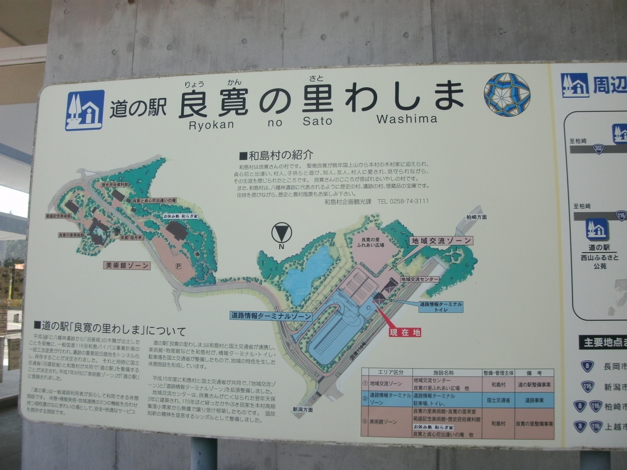 柏崎市街から車で1時間ほど、国道116号線沿いにあります。農産物直売所や産直品お土産売り場、食事処、道路情報ターミナルなど道の駅としての定番の施設がありますが、中でも道路情報ターミナルは24時間空いているので、情報を得たり休息したり長旅をする旅行者にとってはとてもありがたい施設です。人気があるという地元のガンジー牛を使った“ソフトクリーム 380円”を頂きましたが濃厚でそれでいてひつこくなく滑らかで美味しかっです。道路情報ターミナルから少し奥に進むとには良寛の里美術館もありますので、のんびり一休みするのにもよいところです。
