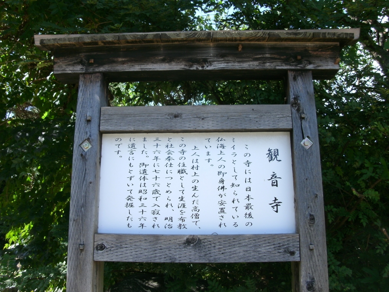 JR村上駅から歩いて10分足らずのところにあります。村上市内をブラブラ観光していた時に偶然お寺の前にあった『この寺には日本最後のミイラとして知られている仏海上人の即身仏が安置されています。』という案内板を見つけて参拝させていただきました。
