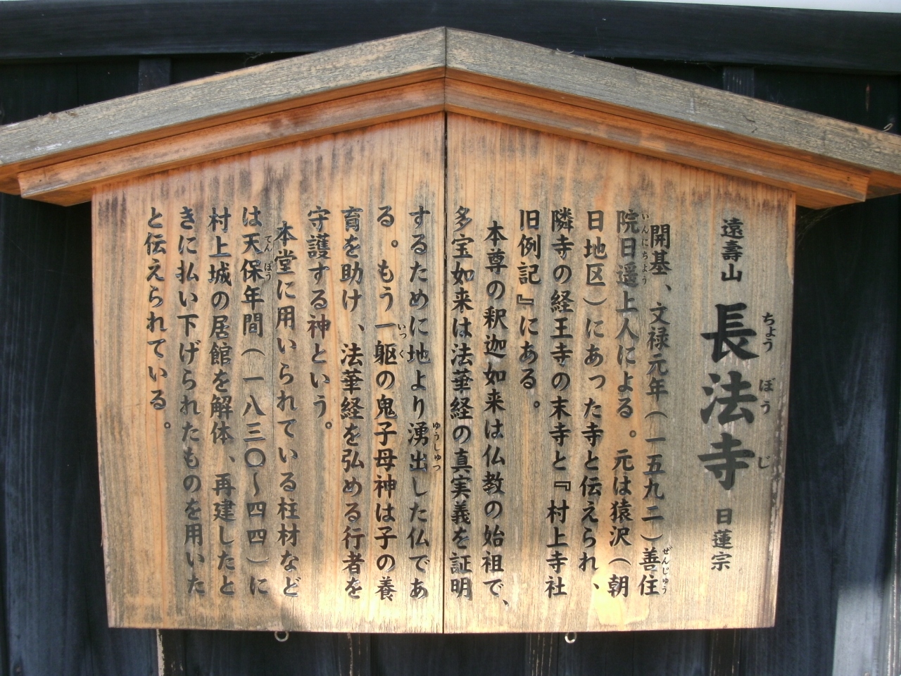 JR村上駅から歩いて15分ほど、“寺町”にあります。「長法寺」は、山門の右手に掲げられた由緒書きによると、開基は文禄元年(1592年)という420年の歴史を持つ由緒あるお寺さんで、本堂は天保年間(1830~1844年)に村上城の居館を解体、再建したときに払い下げられて造られたそうです。由緒の詳細は写真をアップしますので参照ください。