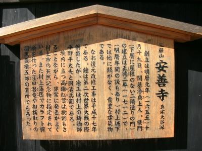 JR村上駅から歩いて20分ほど、安善寺の南側に続く小路です。現地にあった説明版によると、『安善小路と周辺地区を城下町らしい昔ながらの景観に戻そうと、平成14年、住民発意で始まった活動・・・』により整備された通りだそうです。詳細は説明版の写真をアップしますので参照ください。