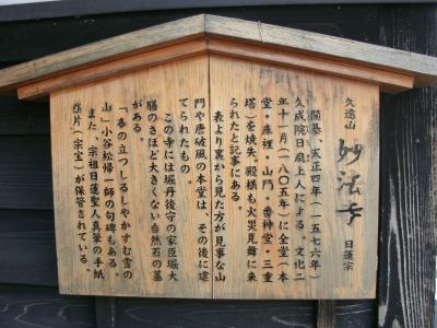 JR村上駅から歩いて15分ほどのところにあります。立派な山門の横にある駒札(由緒書き)には、『開基、天正四年(1576年)久成院日扇上人による。』とあります。文化二年(1805年)に本堂や庫裡、山門、三重塔などが焼失し、現在の立派な山門や唐破風の本堂は、その後に建てられたものだそうです。由緒の詳細は写真をアップしますので参照ください。