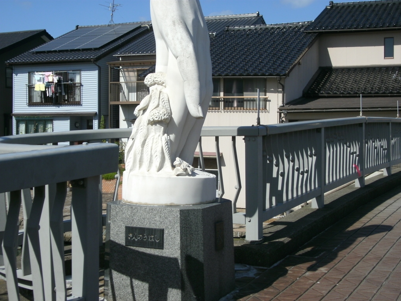 射水市観光協会で頂いた“水辺の回廊&橋マップ”によると、『金属造形作家 蓮田修吾郎氏がデザイン。延長約23m・幅10m、金属とコンクリートがマッチした現代感覚あふれた橋』と記載されています。