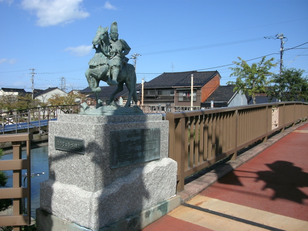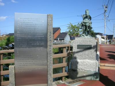 橋の袂には、室町幕府10代将軍 足利義材の銅像と説明用のパネルが設置されています。パネルには、義材が戦いに赴く様子などが描いてあり、歴史が解ります。