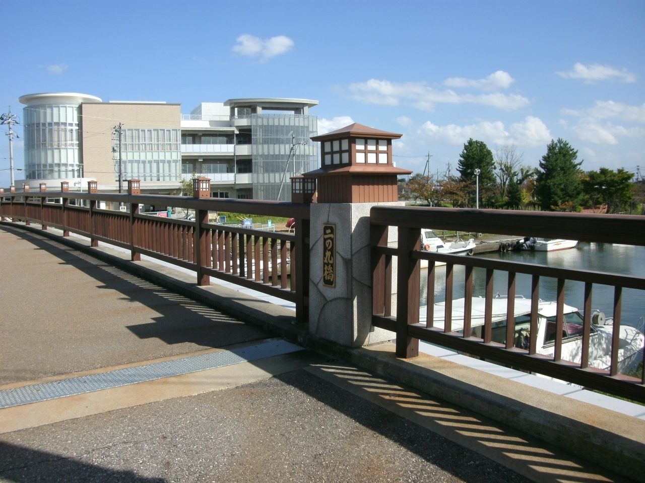 新湊の富山新港に流れ込む内川に架かる橋です。放生津城の二の丸にちなんで名付けられたもので、城をイメージしたデザインになっています。