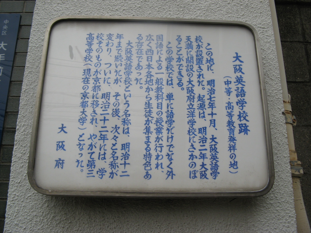 説明版には、『大阪英語学校跡(中等・高等教育発祥の地) この地に、明治七年十月、大阪英語学校のが設置された。起源は、明治二年大阪天満に開設の大阪府立洋学校にさかのぼることができる。この学校では、単に語学だけでなく外国語による一般教科目の授業が行われ、広く西日本各地から生徒が集まる特色ある存在であった。大阪英語学校という名称は、明治十二 年まで続いたが、その後、次々と名称が変わり、ついに、明治二十二年には、学校そのものが京都に移され、やがて第三高等学校(現在の京都大学)となった。』と記されています。