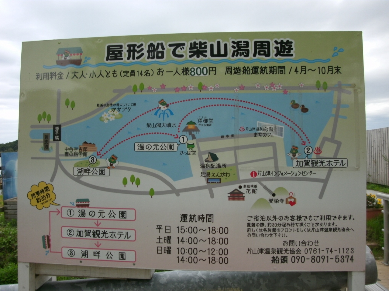 片山津温泉街の中心、“総湯前”の交差点から柴山潟の湖畔にある湯の元公園に行く途中にあります。