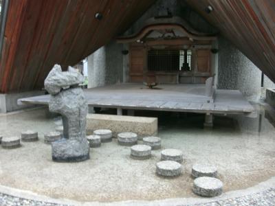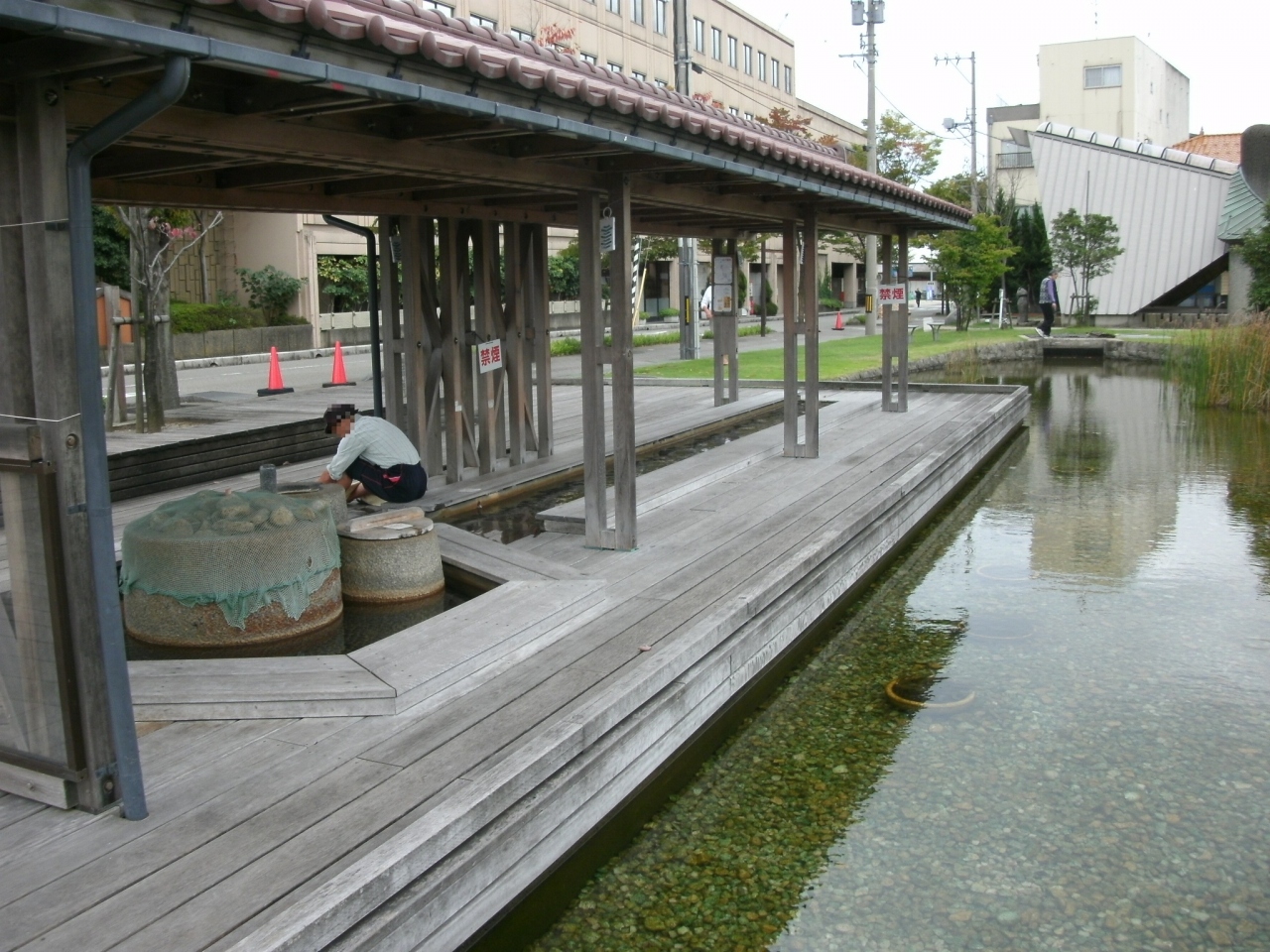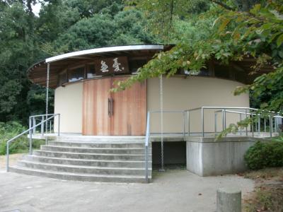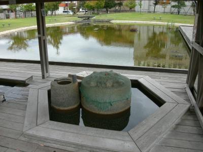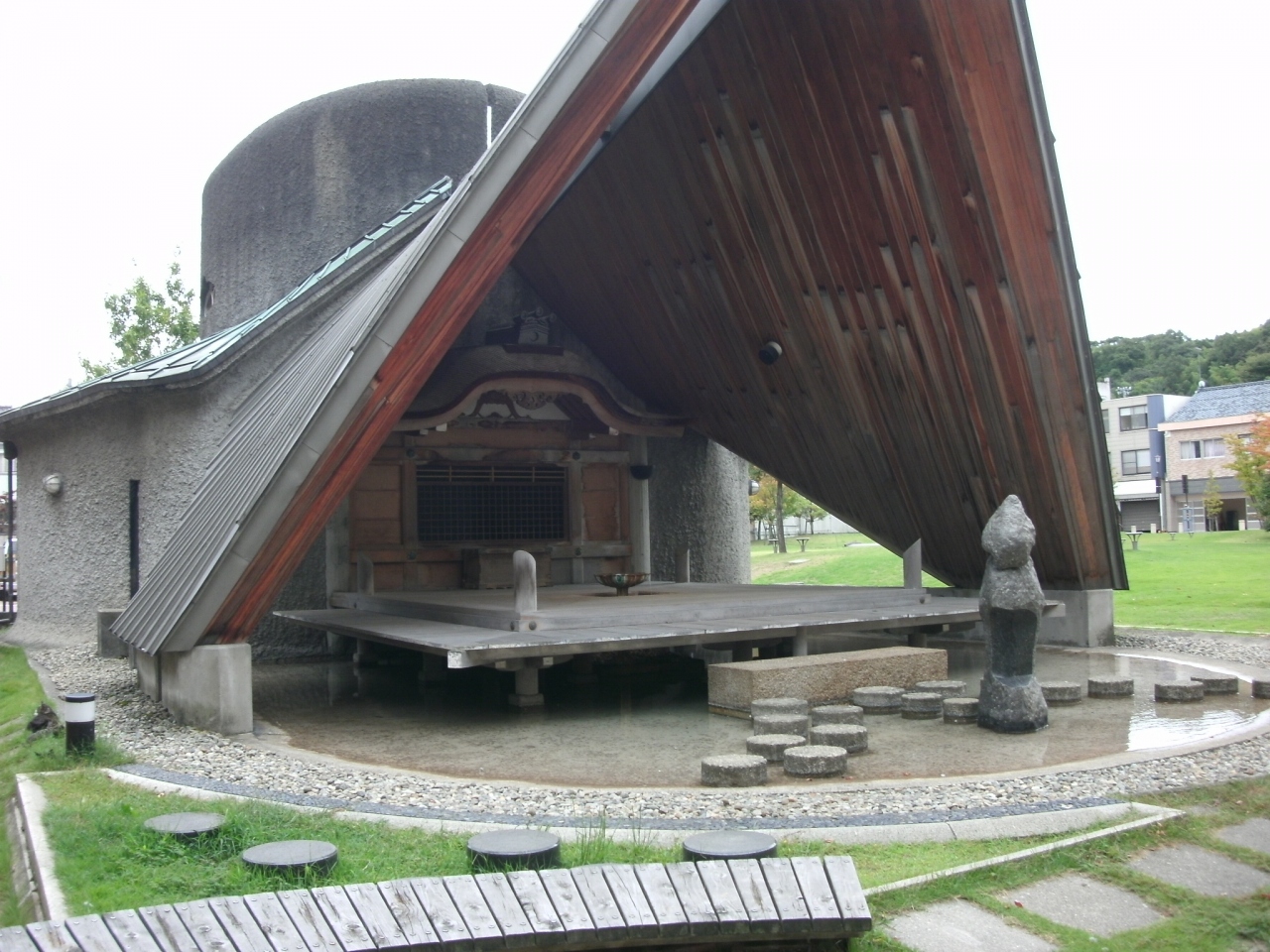 三角形の屋根を持つユニークな形をした建物で、最初見たときは小さな屋外ステージかと思いましたが、傍にある説明板を見て、片山津温泉の湯を各旅館へ送るための施設であることが判りました。