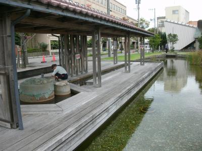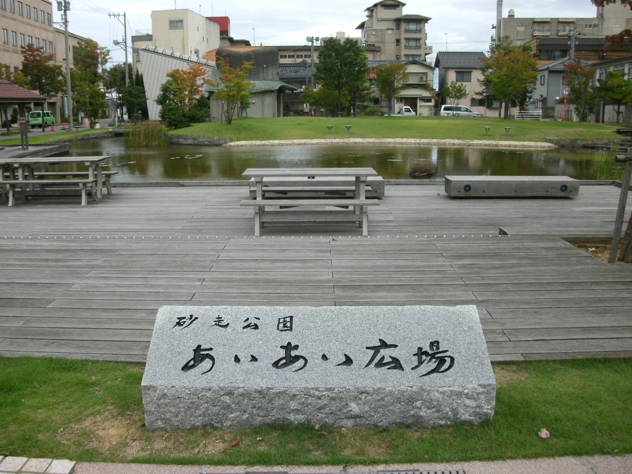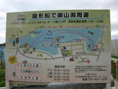 温泉街中心にあにあります。それほど広くはありませんが、柴山潟をイメージしたという大小2つの池や芝生広場などからなる公園です。ベンチやウッドデッキ、足湯施設なども整備されています。特に、源泉100パーセントという無料の足湯施設は屋根もある立派なものです。温泉街散策時に立ち寄って休憩したりするのにいいところです。