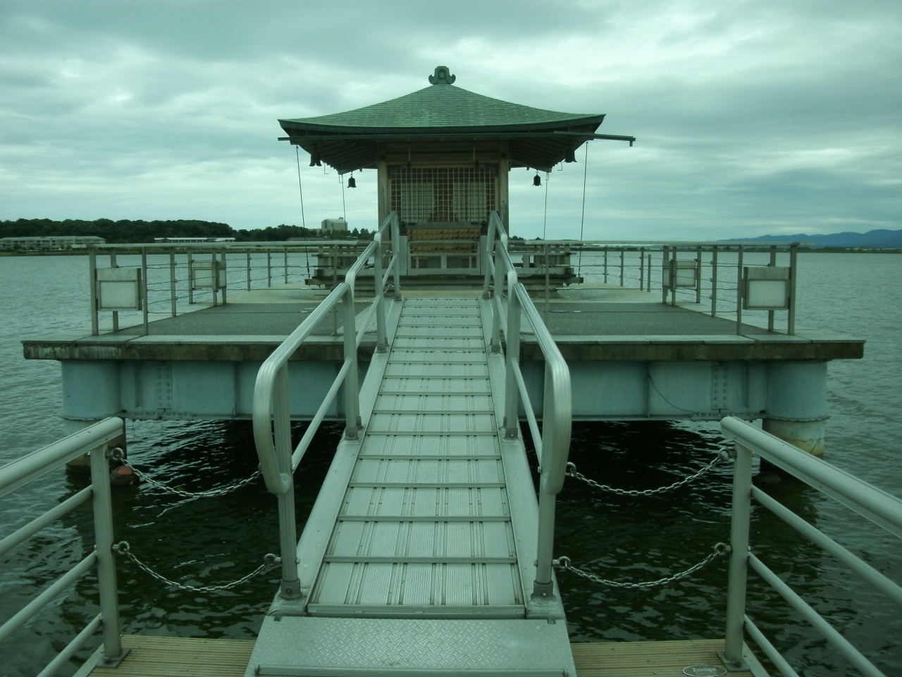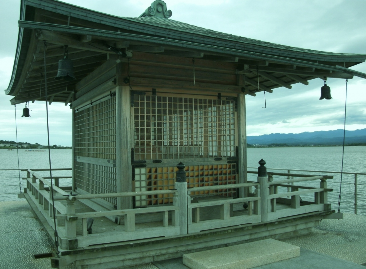 片山津温泉街の中心近く、柴山潟に浮かぶ珍しいお堂です。柴山潟湖畔の湯の元公園とは浮き坂橋で繋がっているので歩いて渡ることが出来ます。