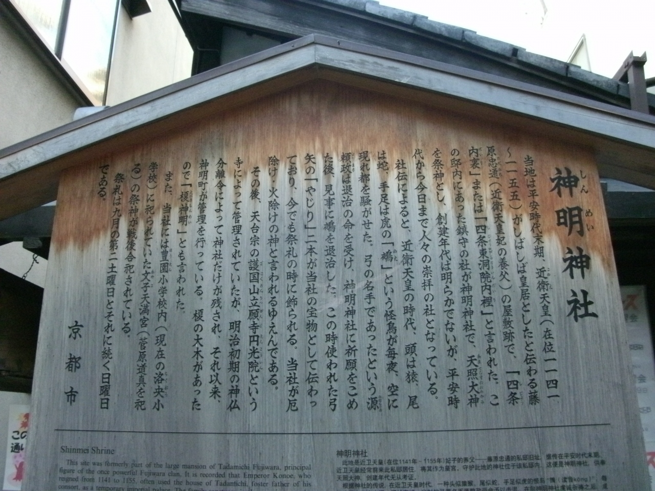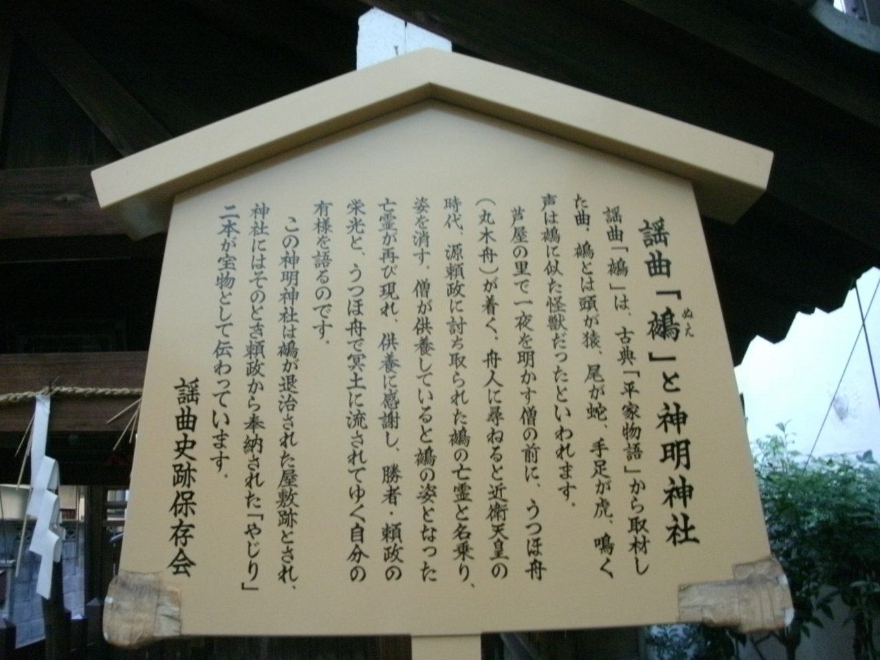 四条通りの1本南側、綾小路通り東洞院を入ったところに鎮座されています。現地にあった駒札によると、平安時代から崇拝されている古社だそうで、近衛天皇の時代、天皇を苦しめた頭は猿、尾は蛇、手足は虎の「鵺(ぬえ)」という怪鳥を源頼政が退治し、その時の矢じりが社宝として伝わっているとか。詳細に付いては駒札の写真をアップしますので参照下さい。「鵺(ぬえ)」という言葉は知っていましたが、ここで退治されたということをし始めて知り、勉強になりました。