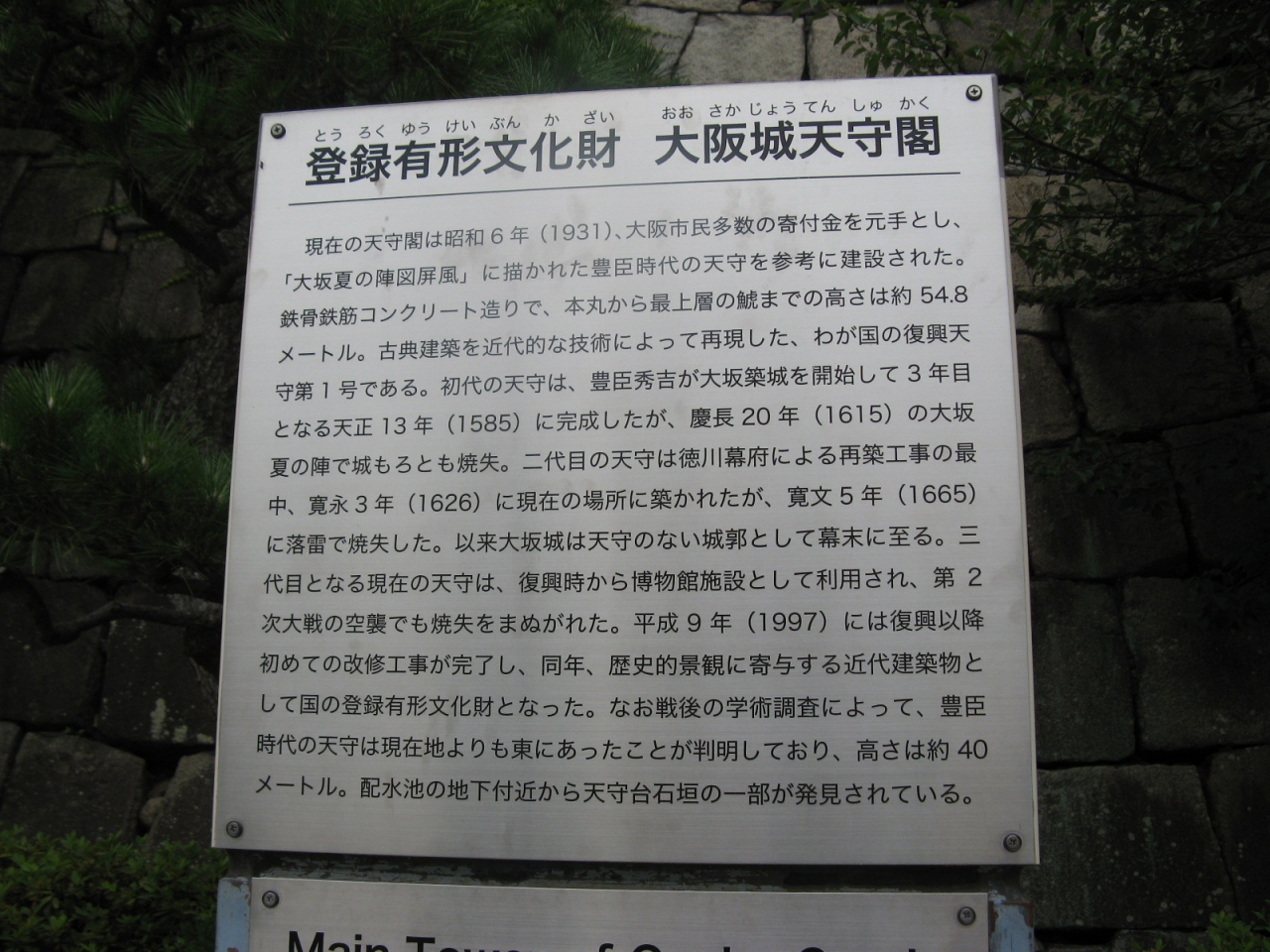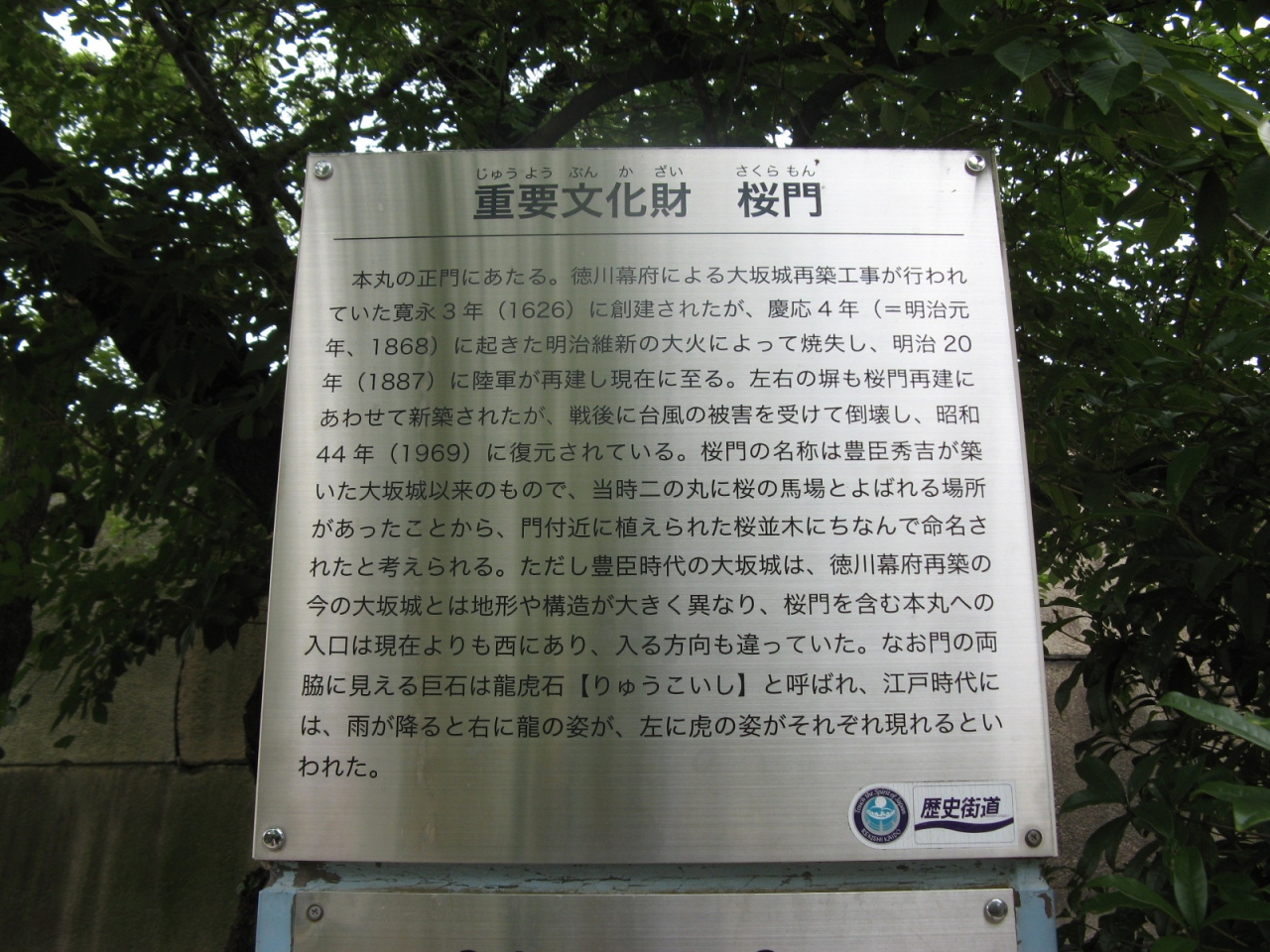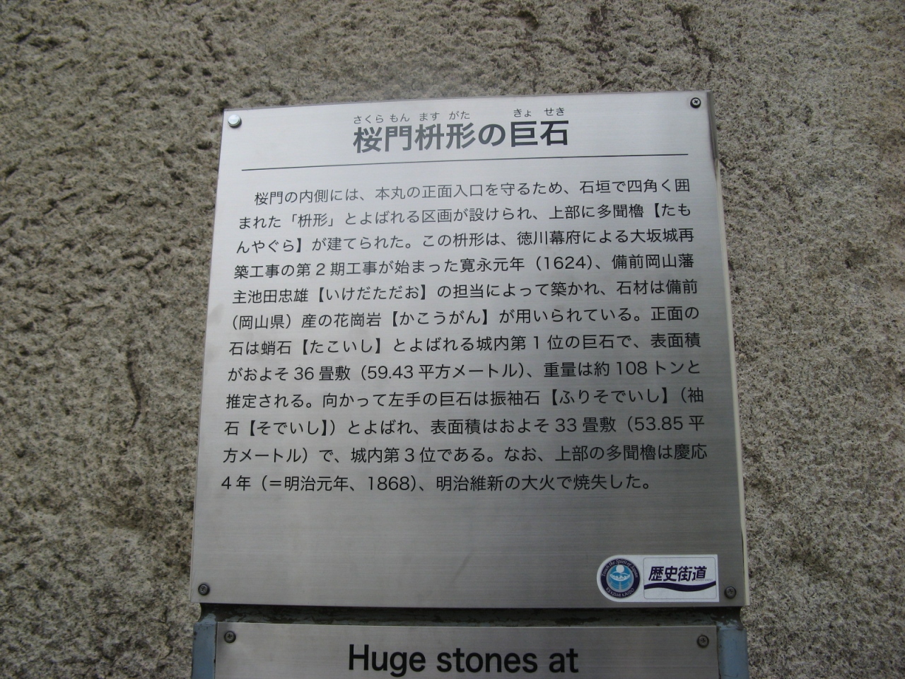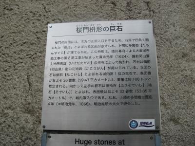 大阪城の建造物の多くは戊申戦争や太平洋戦争の空襲で失われているが、石垣はほとんどがそのままの姿で残っていて、使用されている巨石群、石垣全体に見られる見事な扇の勾配など大変見応えがあります。