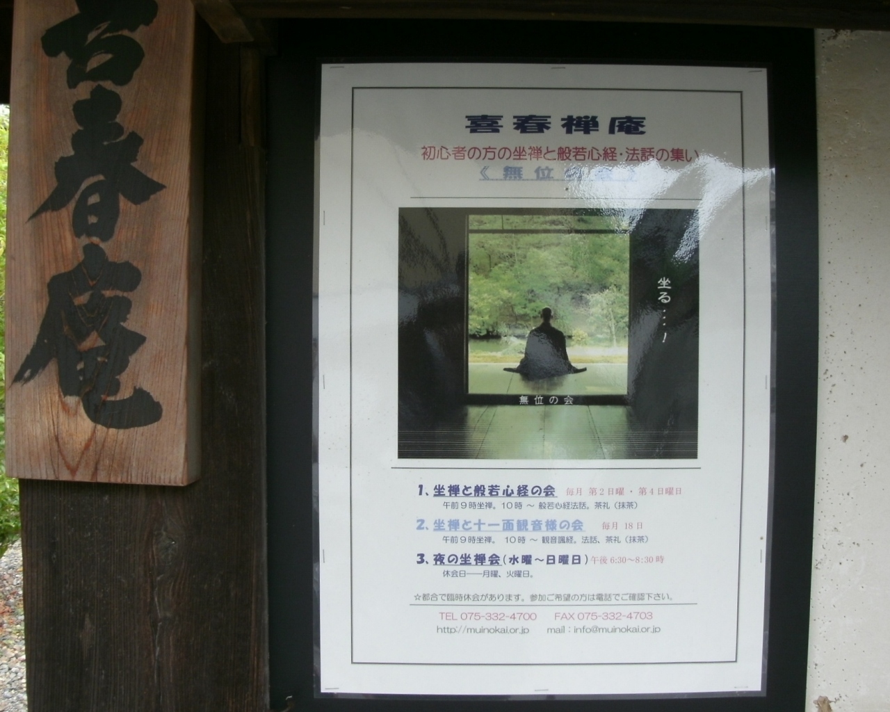 山門横に毎月定期的に“座禅の会”が開催されているという案内がありました。参拝したときは、開催日に当たっていなかったので残念ながら参加することが出来ませんでしたが、次回は、事前に申し込んで参加したいと思いました。参考までに、案内の写真を添付しますので、興味のある方は、問い合わせてみられればよいでしょう。- 旅行時期