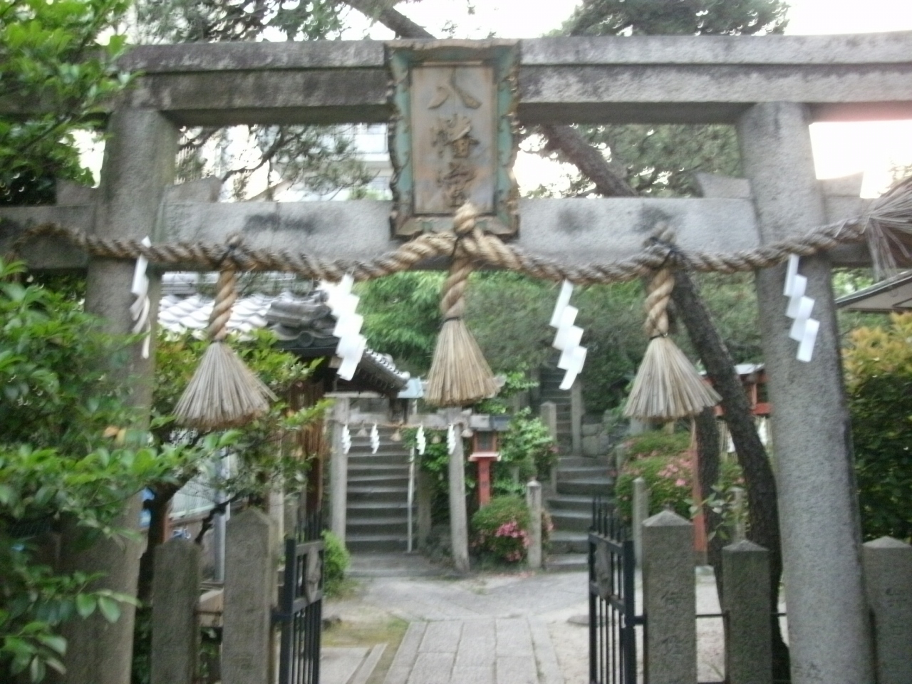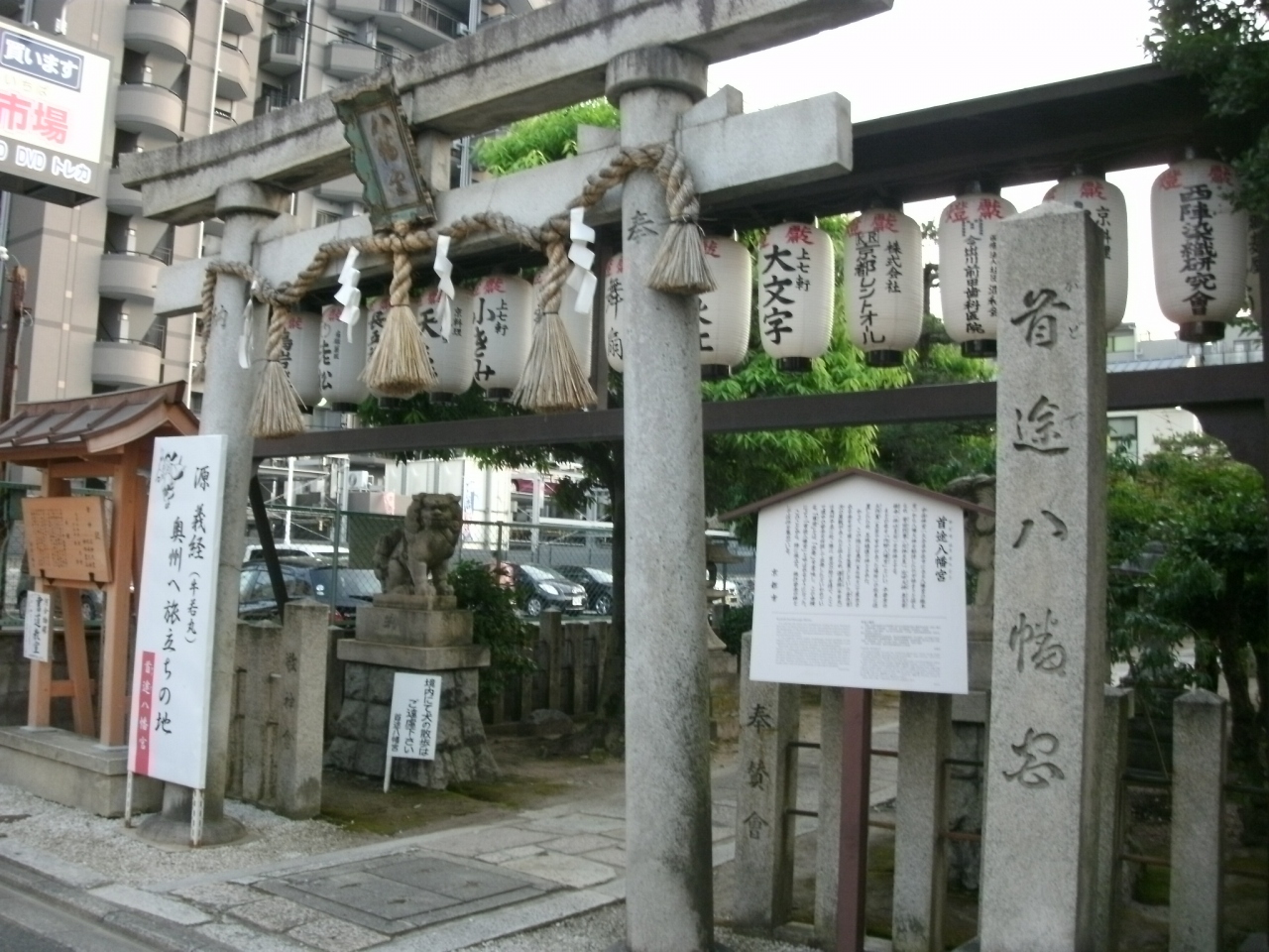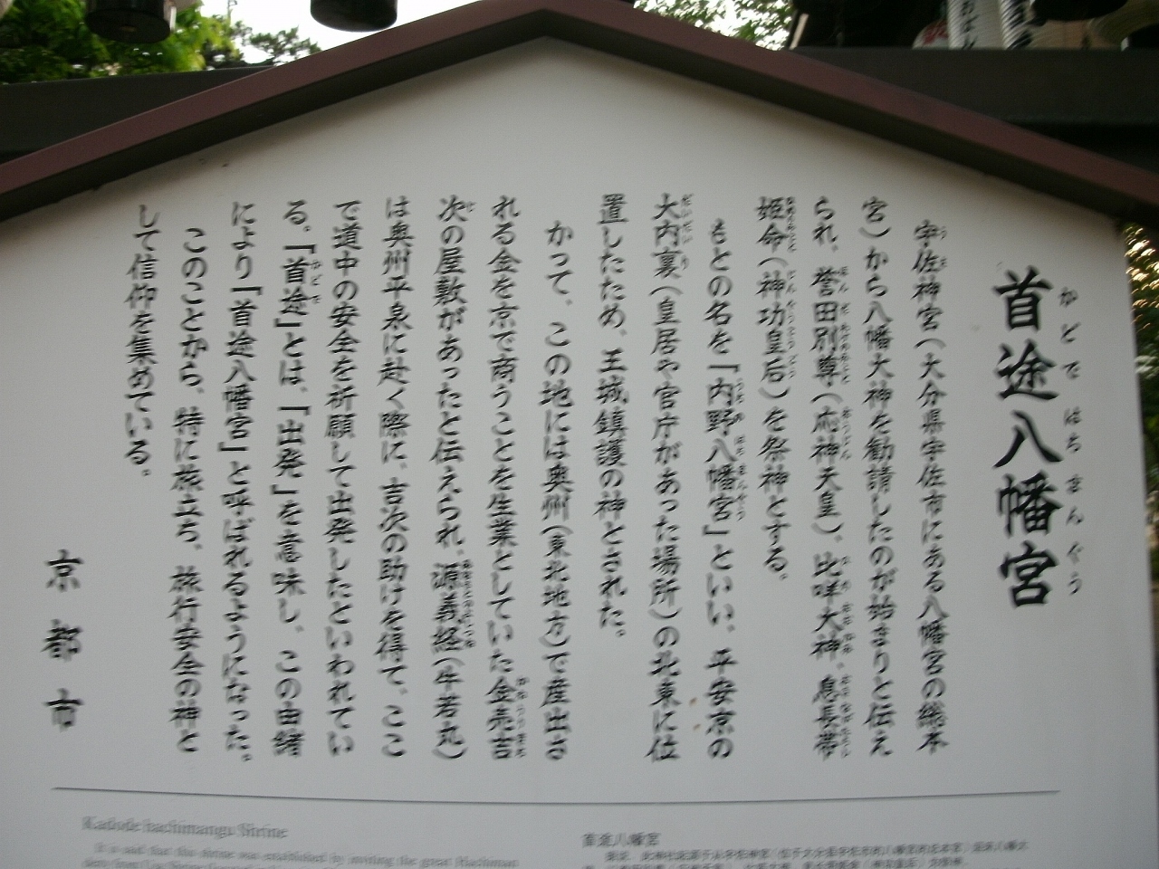 『かどではちまんぐう』と読みます。現地にある説明板には、『源義経が奥州平泉に出発する際にここを訪れて、道中の安全を祈願したそうで、“首途(かどで)”とは“出発”を意味し、その由緒から『首途八幡宮』と呼ばれるようになったとか。このことから、特に旅立ち、旅行安全の神として信仰を集めている』と記載避けれています。境内には“源義経奥州首途之地”の石碑があります。