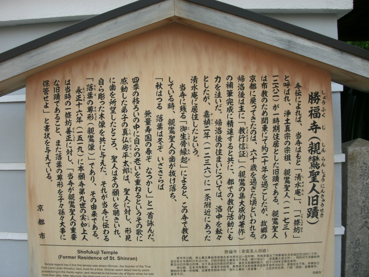 山門横にある駒札(説明板)には、『親鸞聖人が晩年の一時期、住居とした旧蹟で、ここで教化していたときに抜け落ちた歯と自ら彫った仏像を残され、それが今もこのお寺に伝わっている』という意味のことが書かれています。詳細は写真を添付しますので参照下さい。