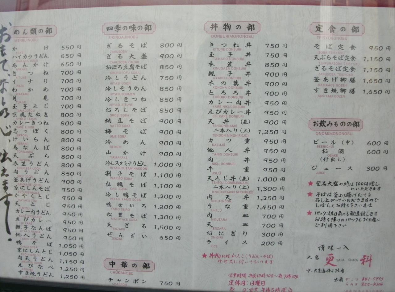 店頭には「Noodle dishes SARASHINA Soba・Udon・Donburi」の看板が掲げられていて、メニューもローマ字が併記されています。付近に用事があった時、これまでに何度か入店していますが、外国の観光客らしいお客さんを見かけることがあり、地元の人だけでなく、外国人にも人気があるお店のようです。