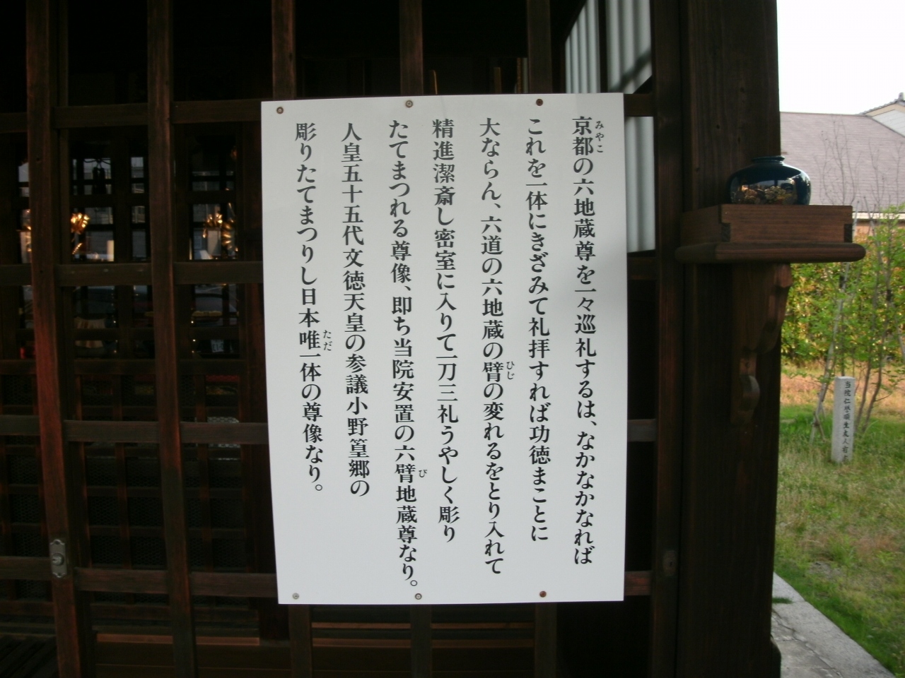 訪れたときは、たまたま、山門に車が駐車されていてお取り込み中のようだったので、お寺の内部に入って参拝することを遠慮しました。京都の街中にある小さなお寺さんですが、駒札を見て、あらためて京都の歴史の奥深さを感じました。- 旅行時期
