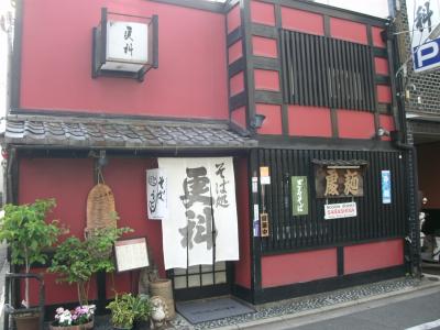 JR二条駅から歩いて10分足らず、大宮姉小路の角にあります。赤い土壁に黒い格子、大きな草鞋が目印になる蕎麦屋さんです。