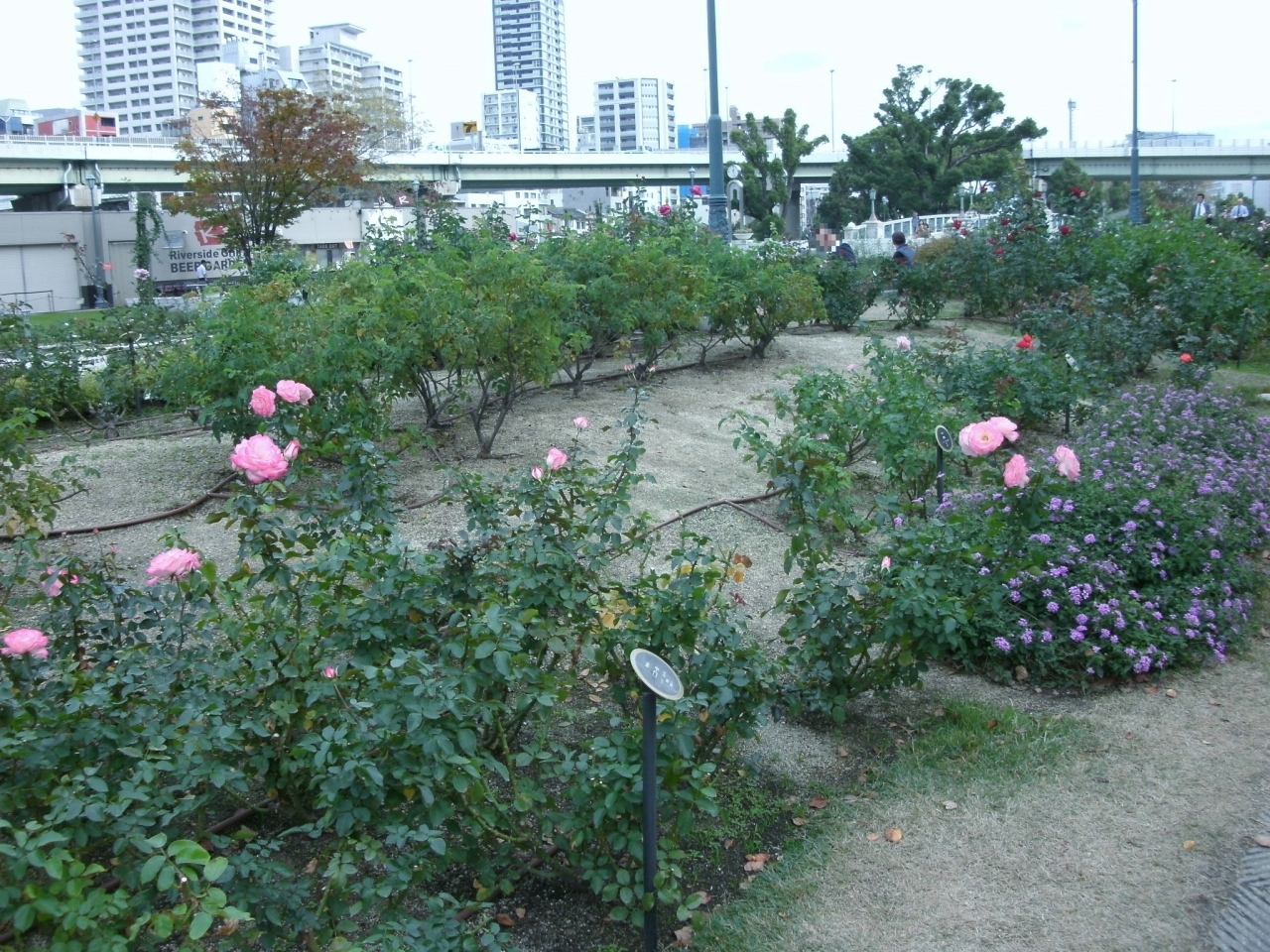 大きな広場にはたくさんの区画に整理されたバラが咲いていました。ここのバラの見ごろは春が五月上旬~六月上旬、秋は十月下旬~十一月中旬だそうで、訪れたのは11月中旬で最盛期ではなかったがなんとか間に合ったという感じでよかったです。