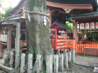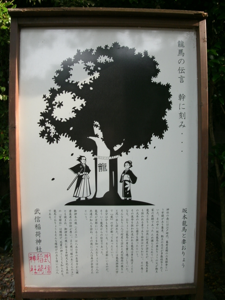 境内にある樹齢850年と言うご神木の榎は、坂本龍馬が妻のおりょうに無事を知らせるメッセージとして“龍”の字を彫ったと伝えられる木で、榎は「えんの木」と読まれることから縁結びの神・恋愛の神として信仰をあつめているそうです。