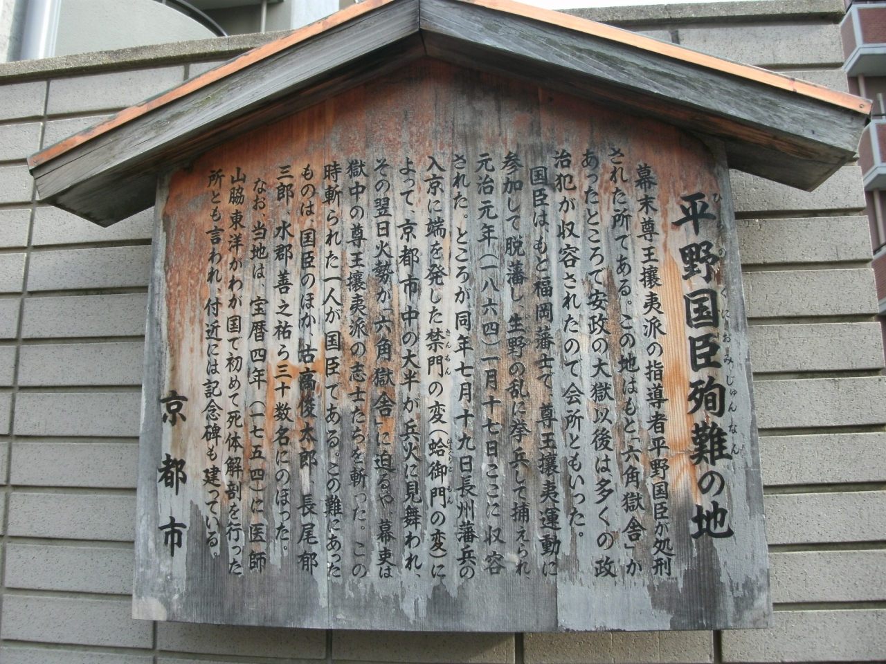 六角獄舎は平安時代に建設された左獄・右獄を前身とする京都の牢獄のことで、獄舎が元治元年(1864年)蛤御門の変で火勢に見舞われた祭に、獄舎に囚われていた志士・平野國臣らが幕吏に殺害されたことを示す石碑が立っています。
