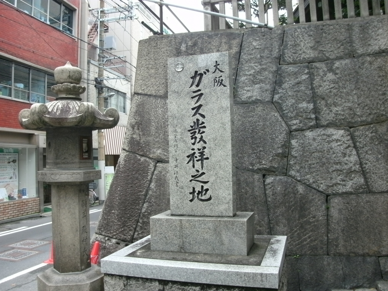 江戸中期に長崎の商人・播磨屋清兵衛がオランダ人が長崎に伝えたガラス製法を学び、大阪に持ち込みガラスの製造を始めたところだそうで、1979年に大阪硝子製品協同組合の設立30周年を記念して建立されたとのこと。