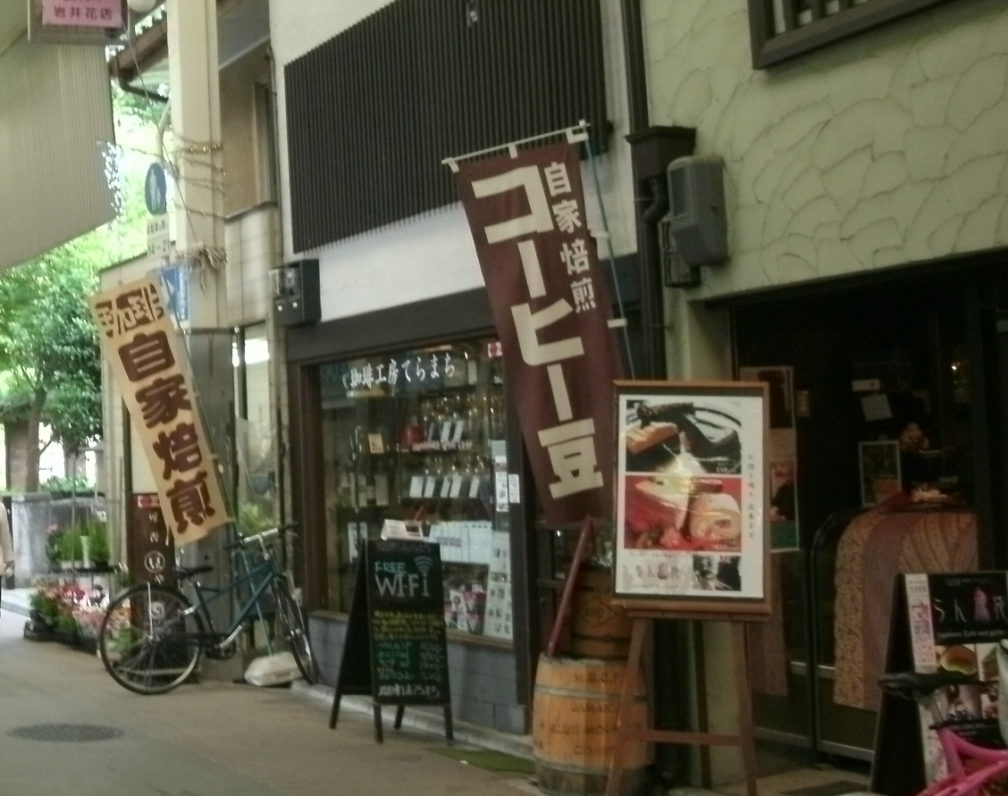 店頭には“豆自家焙煎コーヒー豆”と書かれた大きな幟が掲げられていて、店頭のショーウインドーからはコーヒー豆やコーヒー関連の器具が沢山置かれているのが見えます。