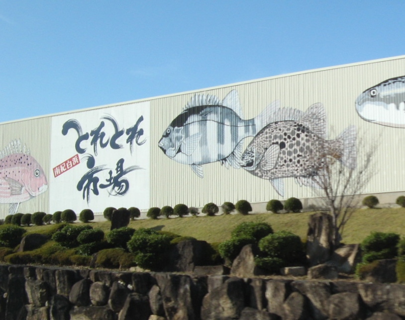 鮮魚や干物などの魚介から、お酒、お菓子、梅、みかんなどのお土産屋さんが多数そろっていて、海鮮ものが頂けるフードコートもあります。魚介は和歌山近海の物だけでなく、日本全国のものが揃っている感じで、観たことも無いような魚もありました。