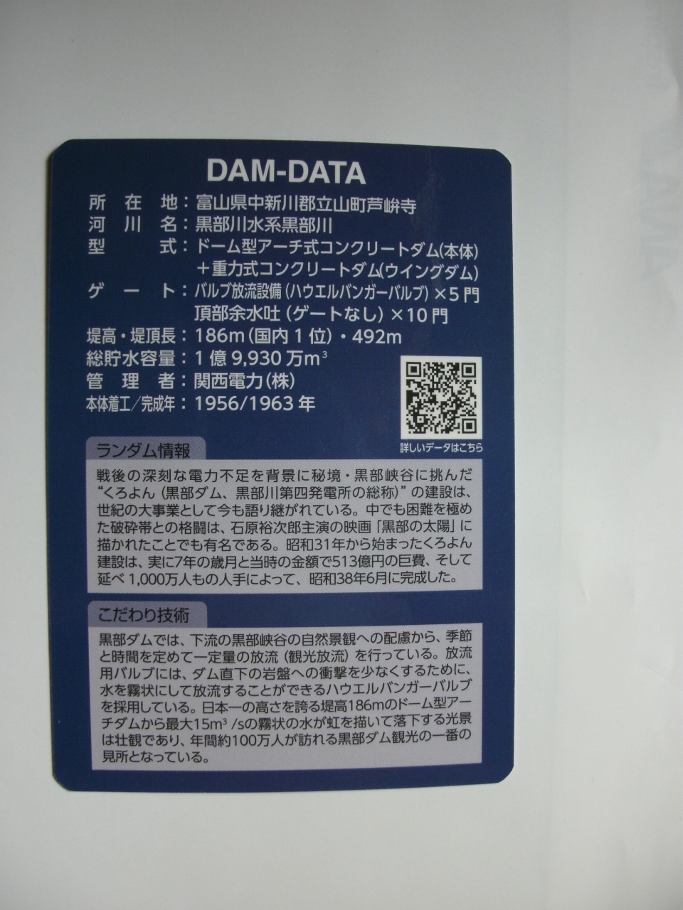 立山黒部アルペンルートで“室堂雪の大谷”を観にいく途中に「黒部ダム」に立ち寄りました。「黒部ダム」は、三度目の訪問ですが、今回の目的は観光とは別に“ダムカード”をもらうことにありました。