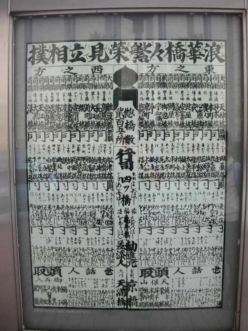また、橋のたもとには、“浪華橋々繁栄見立相撲”と名づけられた番付表がありますので、あわせてご覧になられれば良いでしょう。- 旅行時期