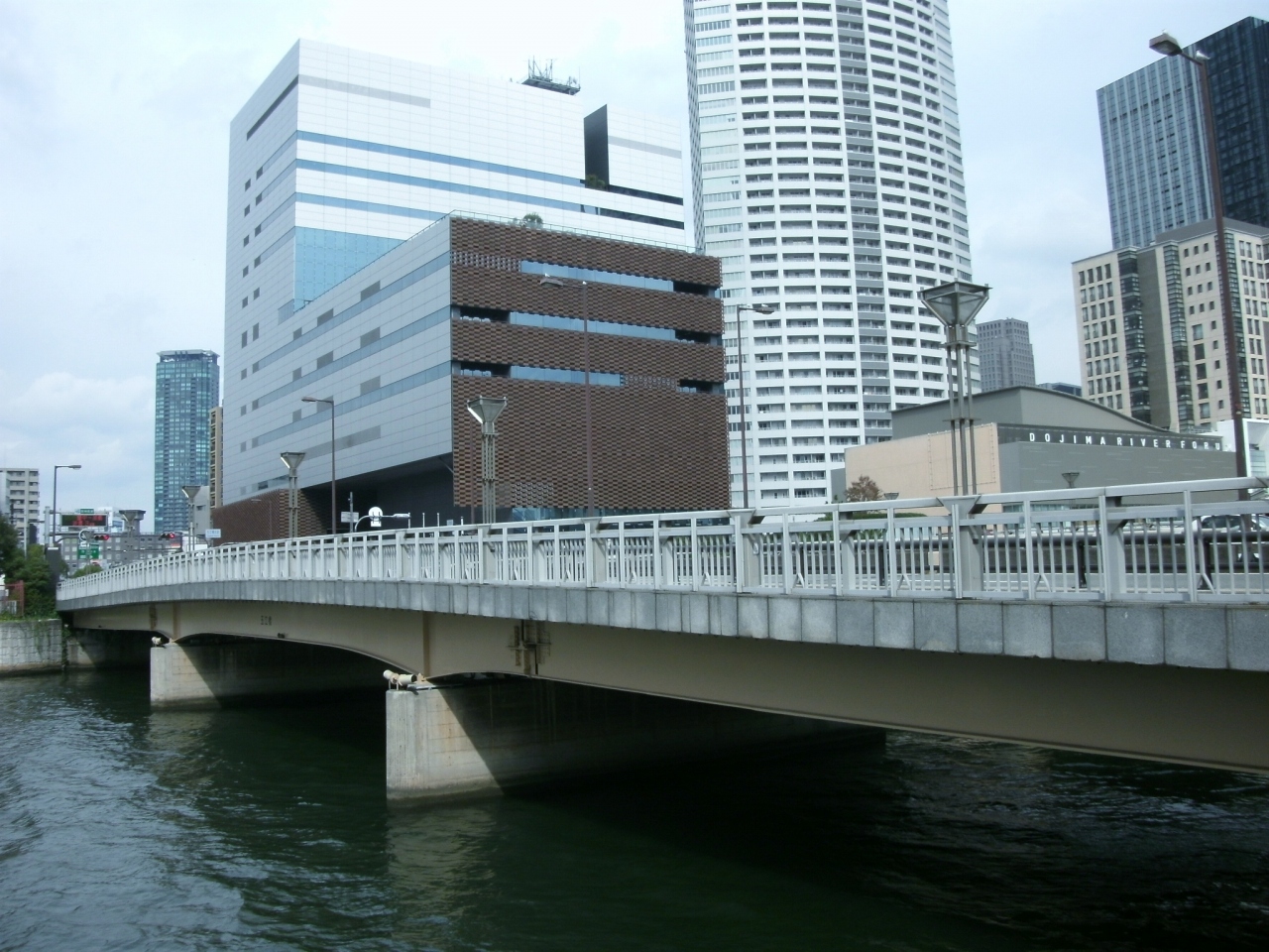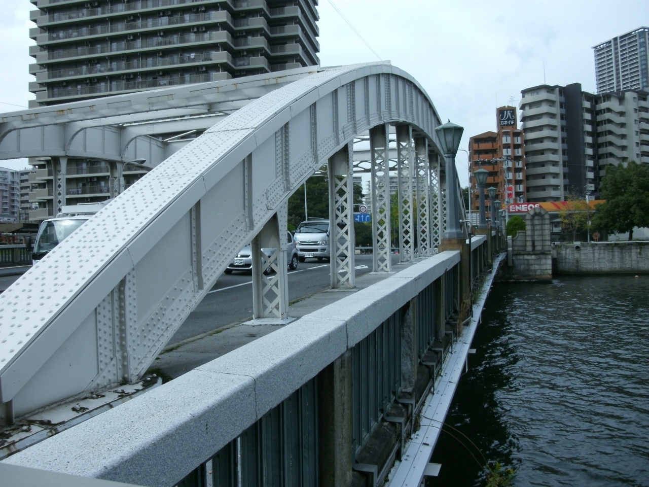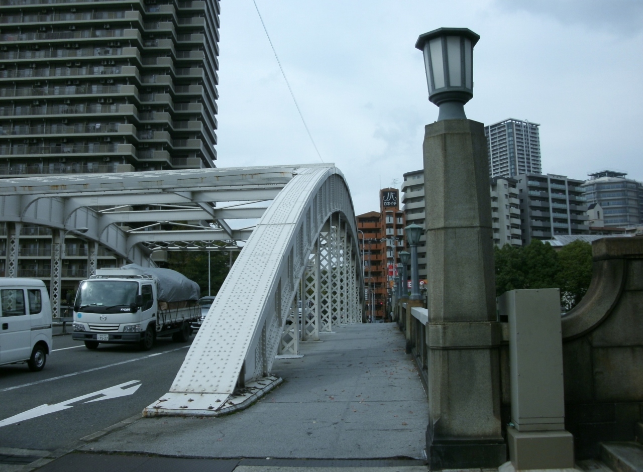 現在の橋は1929年(昭和4年)に完成したもので、その後、拡幅工事や改装工事がおこなわれていて、現在は、アルミ製の高欄やタイル舗装の歩道など外観は新しい感じで特別な印象を受けるような橋ではありません。川辺に高層ビルが林立する橋から観る周辺の風景は、水都・大阪を感じるものです。- 旅行時期