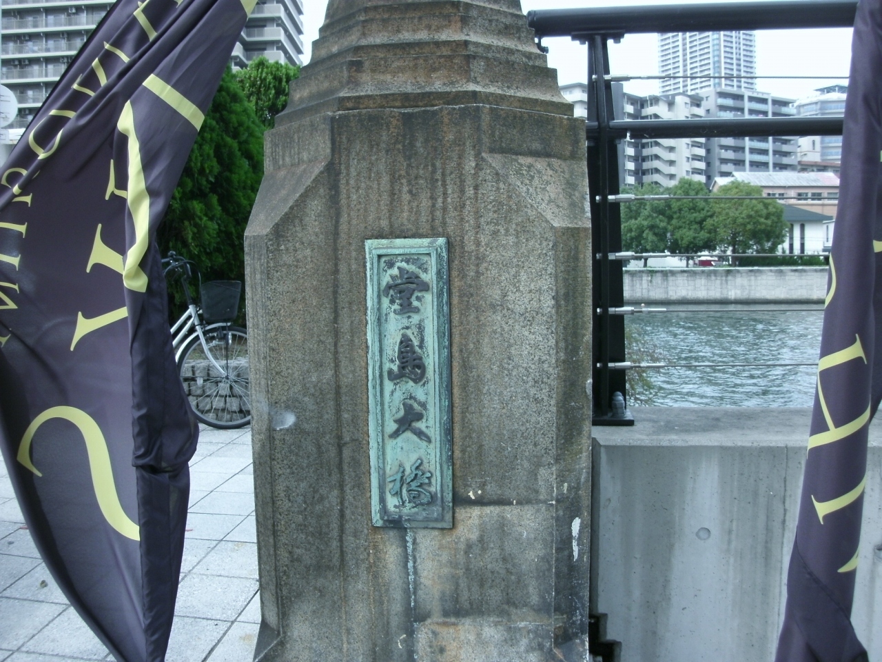 京阪電鉄中之島線中之島駅を出てすぐ北側にある橋です。あみだ池筋の堂島川に架かる橋で、石造りの欄干と鋼鉄製のアーチがレトロな雰囲気を醸し出していて、見応えがあります。石の欄干には、昭和20年にアメリカ軍による空襲で被災した、黒焦等の痕跡が現在でも残っています。