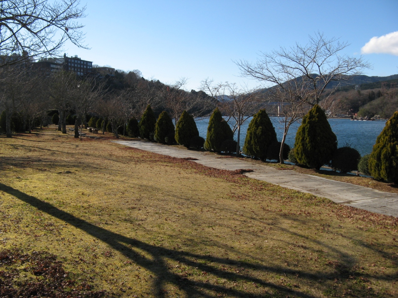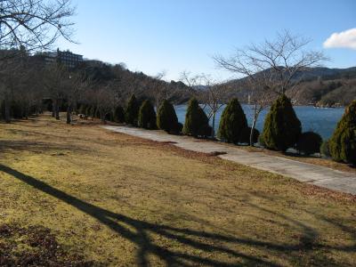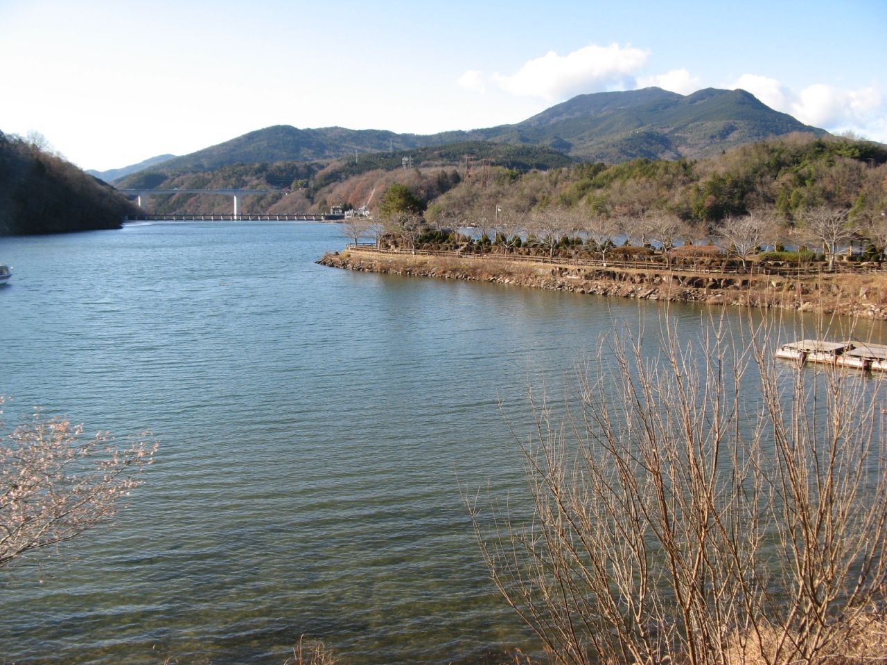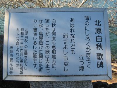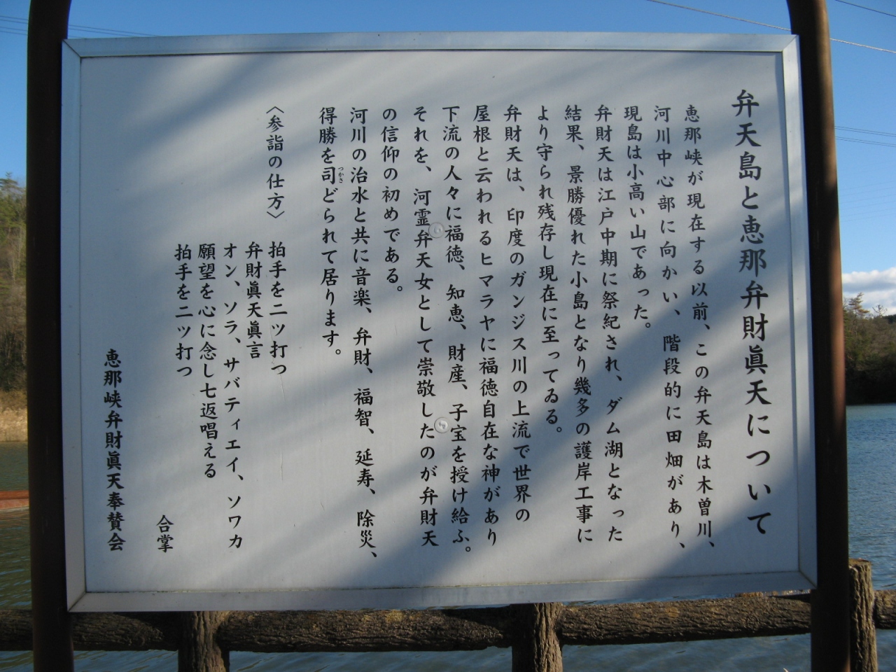 恵那峡のダム湖の右岸、細長く突き出た半島に造られた公園です。遊歩道が整備されており、湖面を見ながら散策を楽しむことが出来ます。半島の先端付近には、北原白秋の歌碑が立っています。公園の東端にある橋を渡ると弁天様が祀られていている小さな島があり、恵那峡大橋を間近に見ることが出来ます。
