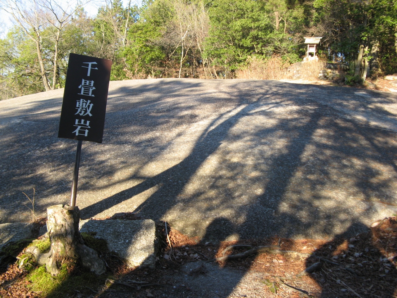 “千畳”あるかどうかは判りませんが、とても大きな一枚岩で頂部が広く平なところから、千畳敷岩と呼ばれているようです。岩の上からは恵那山と恵那峡の一部を見渡すことが出来ます。