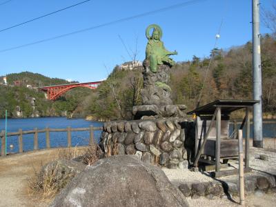 恵那峡遊覧船乗り場の手前の無料駐車場から歩いて5分ほどのところにあります。
