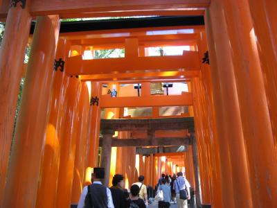 伏見稲荷大社の本殿の奥から稲荷山に向かう途中に朱色に「千本鳥居」が建ち並んでいます。朱色に塗られた鳥居が美しく建ち並ぶ風景に感動しましたが、外国人や修学旅行生など観光客が多くて神秘的な雰囲気を感じることはありませんでした。異空間にいるようなより不思議な感じを体感するのなら観光客が殆んどいない早朝がよいかも。