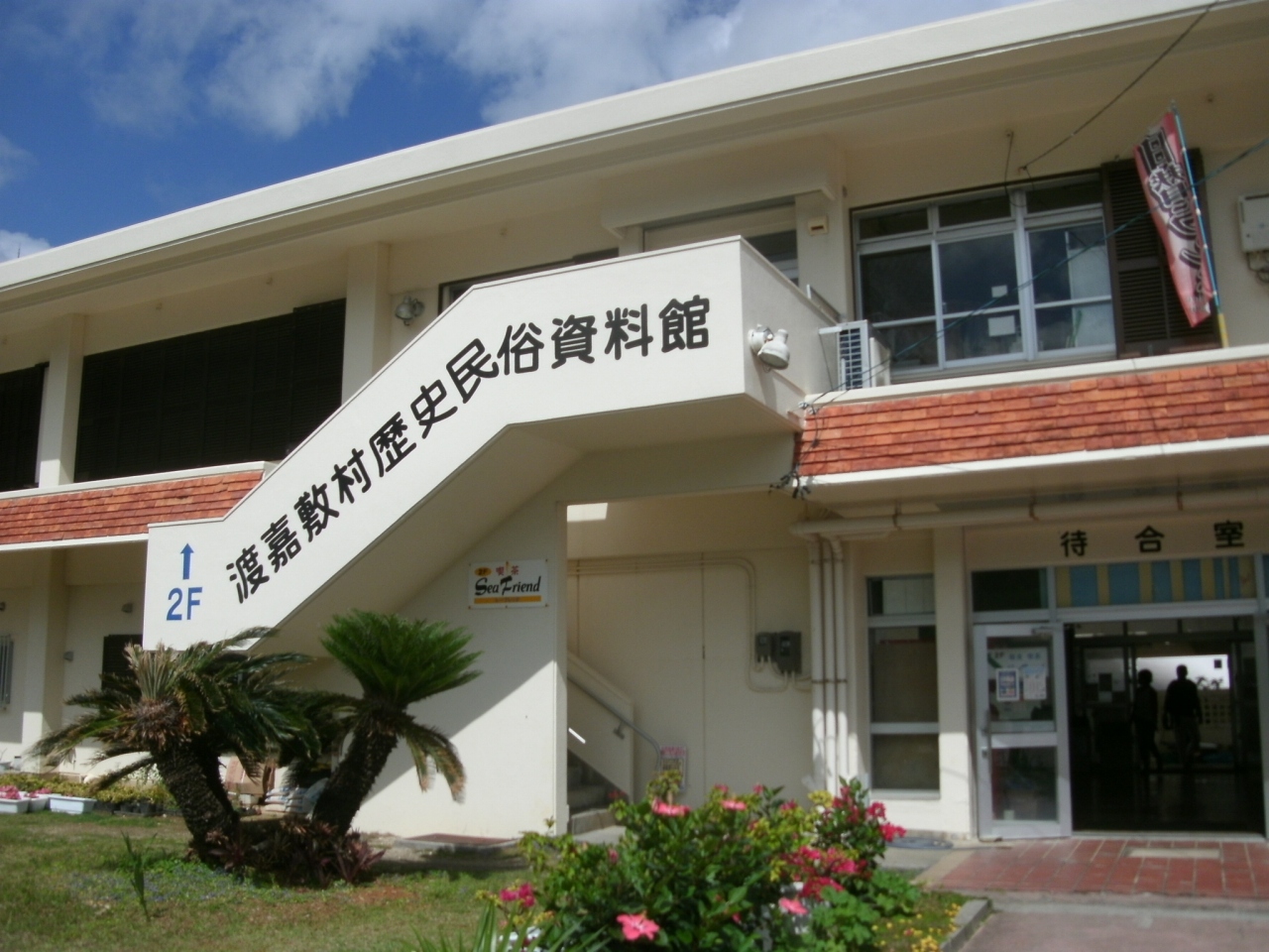 「渡嘉敷村歴史民俗資料館」は、渡嘉敷港フェリーターミナルのすぐ裏の観光案内休憩所・お土産店の2階にあります。渡嘉敷村に関する資料を展示した資料館で、全国でわずか4体しかないと言うザトウクジラの全身骨格標本や島に棲む鳥や爬虫類などの動物の標本、壺や食器といった生活雑器、戦争当時の衣類などが展示しています。