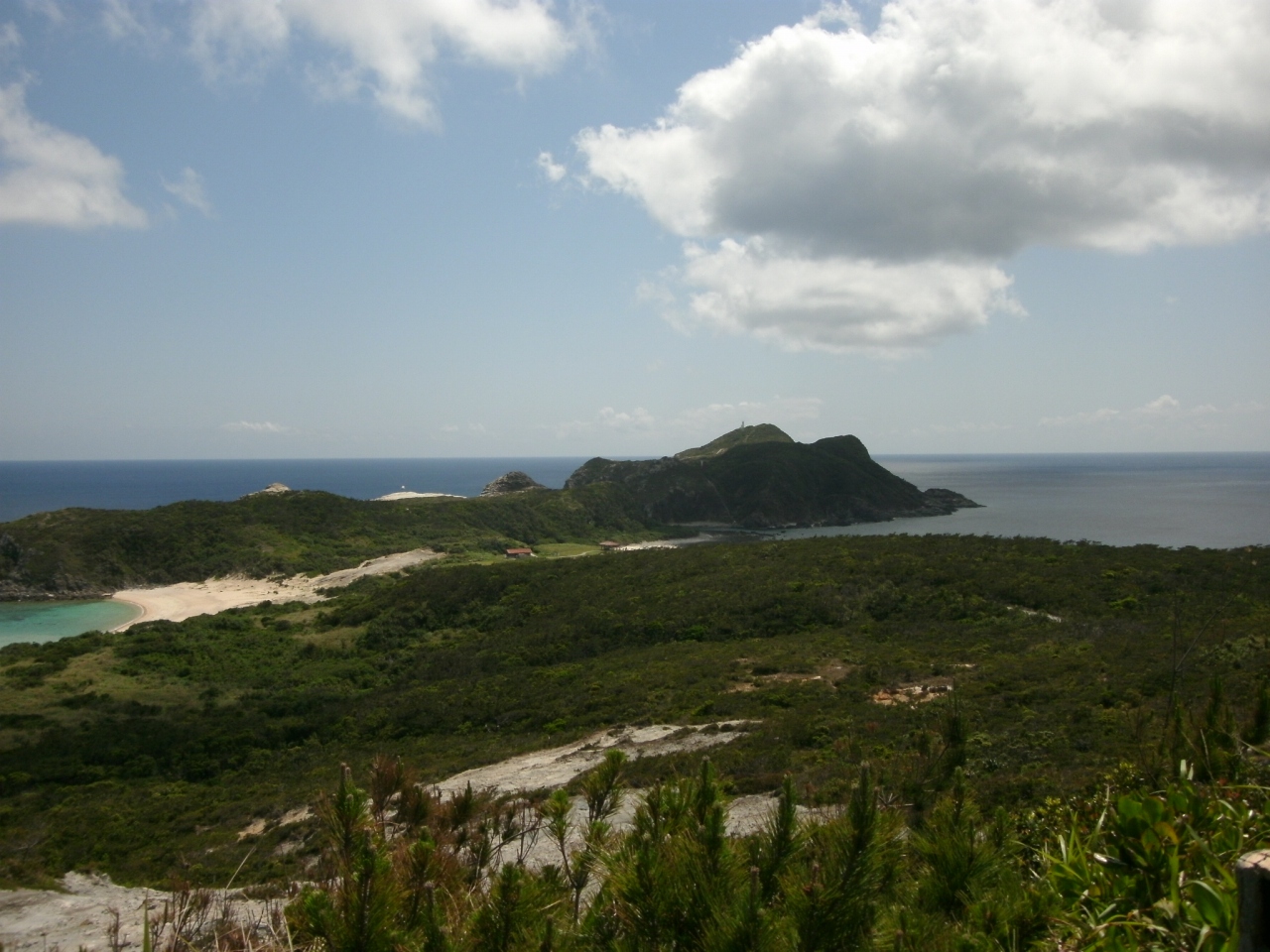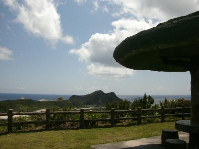 渡嘉敷港から車で20分あまり、久比里林道を経て渡嘉敷島南側にある前岳林道を進んで行くと左手にふれあい施設の園名板があります。そこから200mほどの遊歩道を進んで行くと、広い原っぱの様な園地に茸の様な形をした東屋があって、展望台からは地層の姿がむき出しになった雄大な景気を見ることが出来ます。